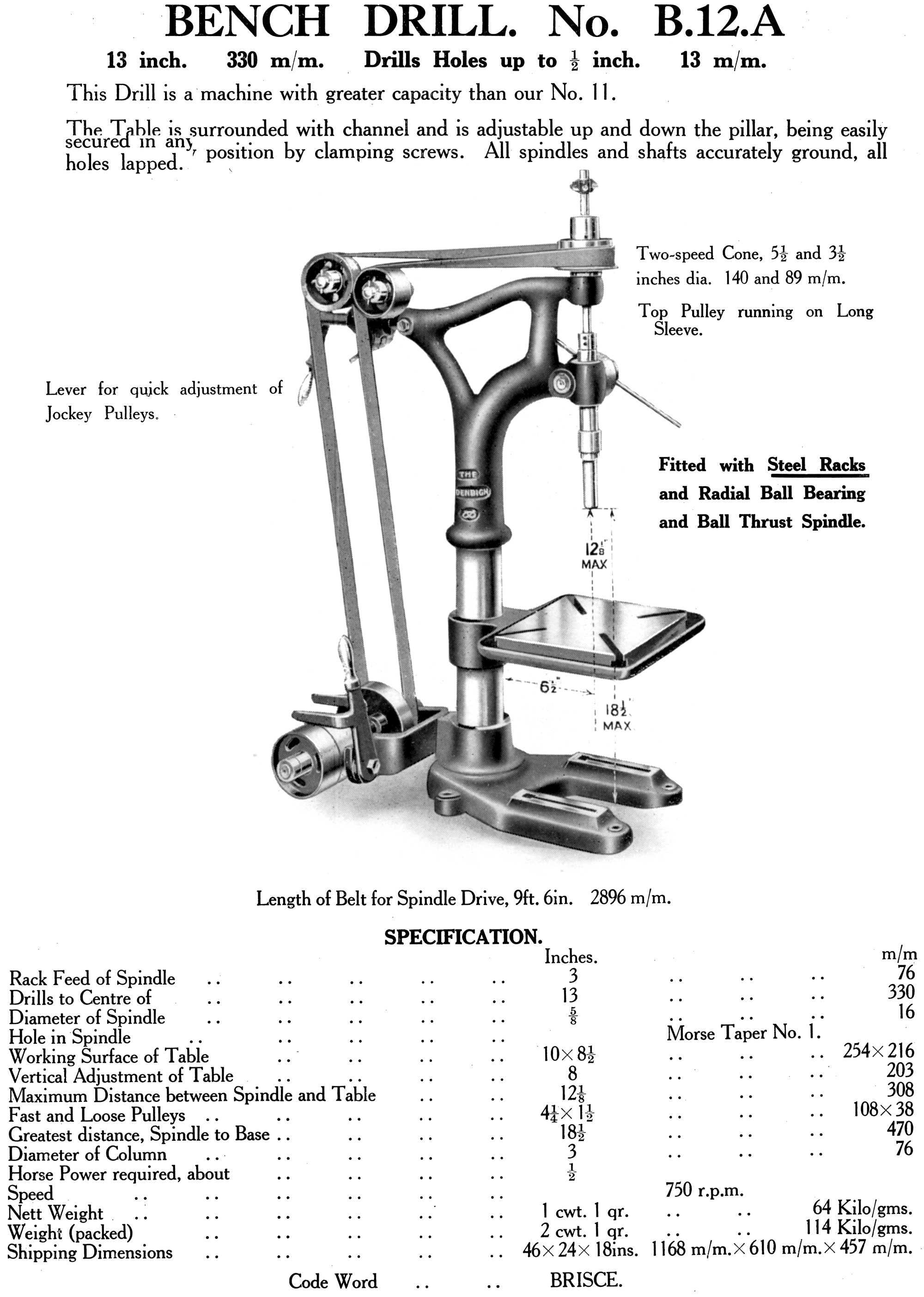 The Denbigh Engineering Co. Ltd. was based at Horseley Heath, Tipton, in Staffordshire, England and manufactured an extensive range of basic machine tools. Tipton, being halfway between Birmingham to the south east and Wolverhampton to the north west, was in the heart of the "Black Country", an area once heavily industrialised and a focal point of developments during the Industrial Revolution. Today the town is home to the Black Country Living Museum, a large, open-air affair with reconstructed buildings showing life as it was in a mid-1800s iron-working town - a real day-out treat for steam and engineering enthusiasts. Describing themselves as "Engineers, Machine Tool Makers, Mill Furnishers and iron Founders", Denbigh appear to have survived until at least the mid 1970s when, at a new address, Malcolm House, Batsford, Moreton-in-Marsh, Gloiucestershire, they were issuing a simple one-sheet price list showing rebranded Elliott-Progress geared head 4E and 5E pillar drills. However, also listed on Company literature was a works address, Stratford Road, Shipton-on-Stour in Warkshire, with a note that they were manufacturers of Pillar Drilling, Horizontal Milling and Power Hacksaw Machinery. In pre-WW2 years Denbigh's output consisted of the Type B and "New B" heavy horizontal milling machines, the lighter Type H horizontal millers in a number of configurations - H1, H2, H3 and H4 - for bench mounting or fitted to floor-standing cast-iron columns, a wide variety of industrial bench and pillar drills, a foot-lever press, wet and dry tool grinders, two models of metal spinning lathes, two sizes of what the makers termed "polishing lathes" (today they would be regarded as simple polishing stands) and the Company's patented "Hand Jolt Ram", this being an effective hand-operated sand moulding machines for use in foundries. By the mid 1960s the range had been considerably trimmed and, although no lathes were produced, the "Swiftcut" metal-cutting donkey saw had been introduced, a wide range of drills was still manufactured as well as manual and air-operated fly and lever presses and a number of simple, cheaper horizontal milling machines including the Type C, Type D, Type D3, Type M, Type J.P., Type J.V.S, and the Type J.P.V.S. - many being low-priced and of simple design and so finding their way into technical colleges and apprentice training schools. Long a common practice in many spheres of industry, Denbigh also made batches of un-branded milling and other machines for distribution by third parties. In some cases the millers differed from the regular Denbigh specification, some obviously manufactured to a customer's particular requirements. Denbigh drills were of an absolutely conventional design, their origins going back to Victorian times and little developed even after WW2 - though a few more modern bench and pillar drills with enclosed V-belt drive, the K and S Series, had been introduced during the 1950s. Denbigh had their own foundry - unsurprising, as they were in the very heart of the original English iron founding area - and turned out castings to a very high standard. All their machine tools were heavily built, capable of absorbing continuous industrial use and were widely exported. Although their original design of "swan-neck" drill might appear hopelessly old-fashioned, they worked (and still do) extremely well with little to go wrong and having reserves of power. One model in particular, the No.1, lasted almost until the company closed in the 1970s, a testament to its simple design and rugged construction. Not so popular were the Denbigh milling machines with these, in later years, being aimed at the school and training markets where great strength and weight were not considered necessary. Fit and finish of these models was also not to a particularly high standard, again, not a serious consideration when price was the prime consideration. Shown below is a range of drills illustrated in a catalogue published circa 1930 and on this page from the 1950s and 1960s. The model designations and numbers chosen by the factory appear to have followed no logical sequence, drills of lesser capacity being mixed up with those of greater - and various suffixes and prefixes applied seemingly at random. No doubt it made perfect sense at the time - but not now. Drills on this page shown with the requirement that safety guards be fitted would date from post 1955 and the Factory Act that made such covers compulsory..