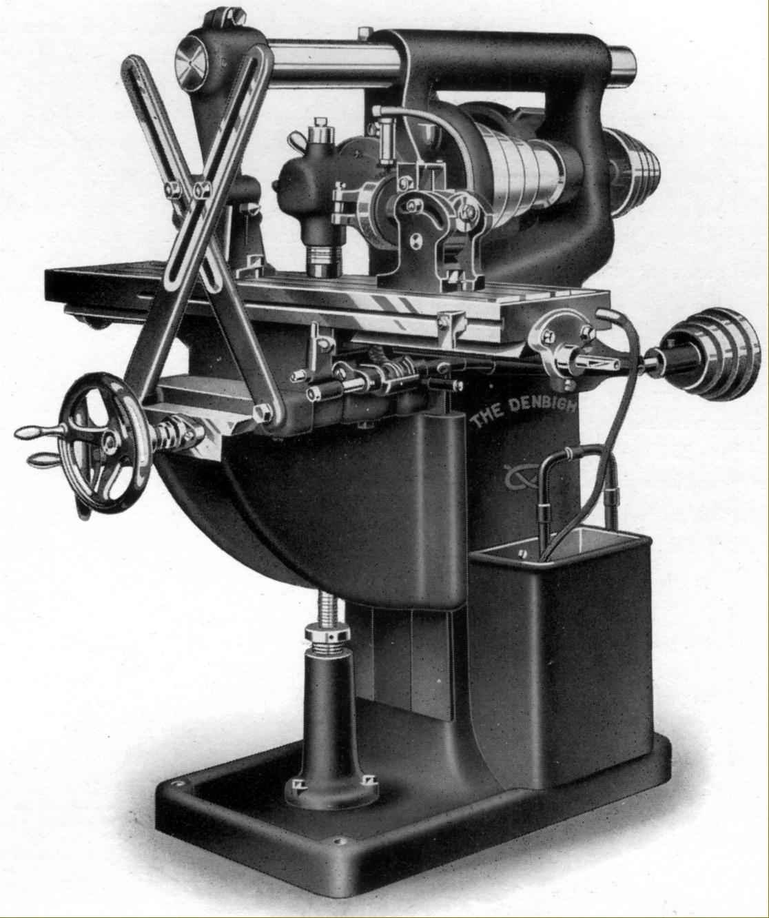 Denbigh "Type H1" light-duty, bench-mount, stub arbor milling machine The type H was in production during the 1920s and 1930s and ranged in style from simple stub millers - like the one above - to versions mounted on cast-iron plinths with integral motor-countershaft systems. Sitting on a 23" x 14.5" (585 mm x 367 mm) cast-iron pan, the H1 had a 16" x 5.5" (406 mm x 140 mm) table with a single T slot and a lever-actuated longitudinal travel of 7" (178 mm) a cross feed of 3.25" (83") and vertically of 7" (178 mm). The spindle, fitted with a No. 3 Morse taper nose ran in tapered, adjustable bronze bearings.
