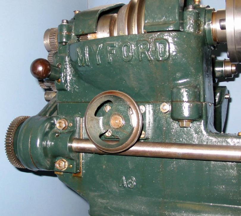 4-inch Myford "Precision" with a Bed-mounted, Integral Countershaft With only two examples discovered light in recent years, this late version of the Myford 4-inch precision is very rare. Built as a long-bed model its countershaft is mounted on the back of the bed in such a way that it can be adjusted vertically. Its upper section, carrying the pulleys, is arranged to pivot under the control of a screw-adjusted rod that passes through the bed from front to back. On the end of the adjustment rod is the ordinary tailstock handwheel from an ML2/ML4