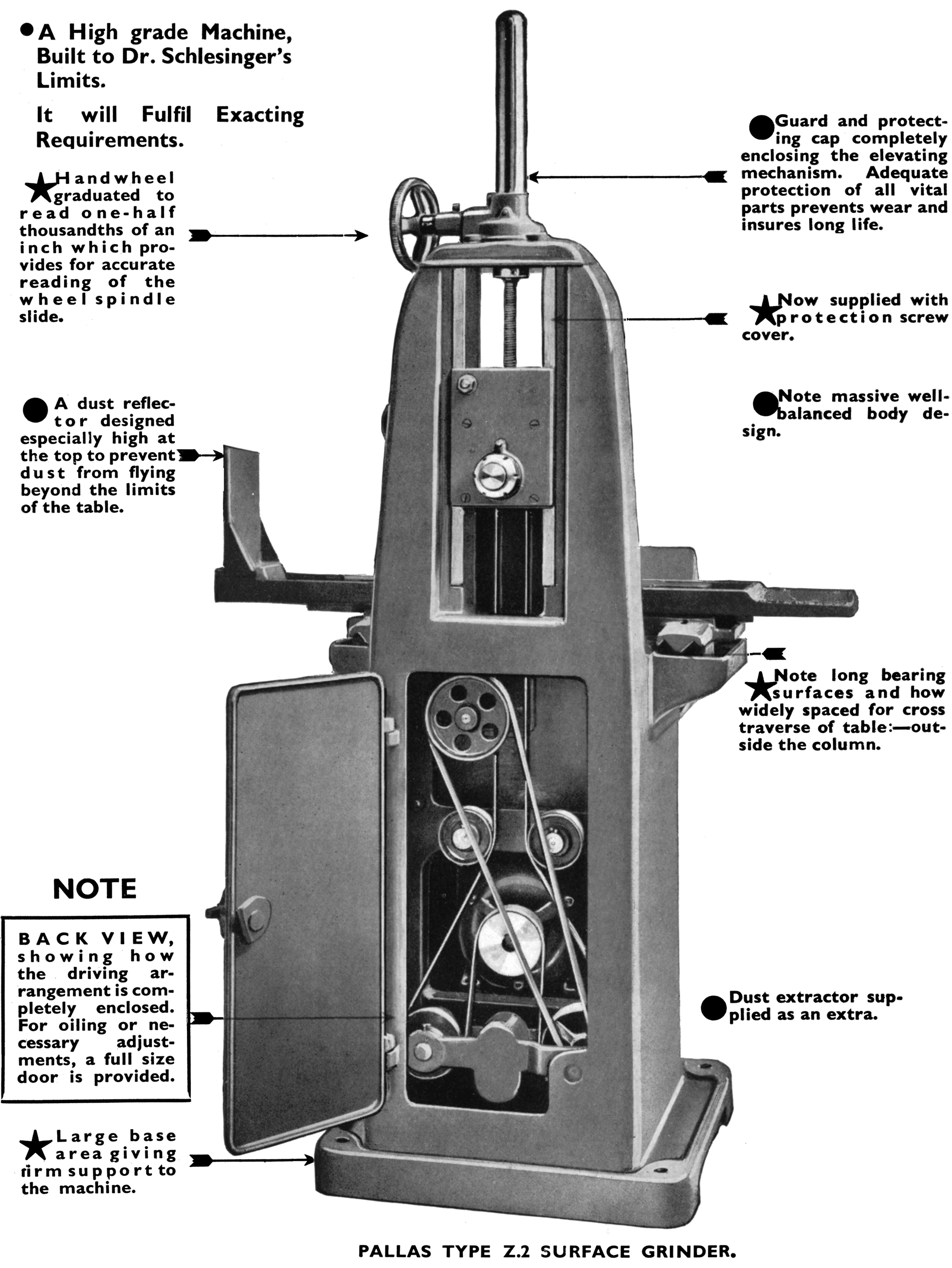 Pallas No. 2Z Built along the exactly same mechanical lines as the Pallas No. 2, the 2Z employed an identical form of mechanical table drive, the limits of which were controlled by stop dogs. With a working surface of 18.5 inches by 6.5 inches, the table had a longitudinal travel of 20 inches and across of 6.5 inches. While the Pallas No. 2 had a grinding spindle running in three spring-loaded, angular-contact ball races, that on the 2Z was hardened and ground and turned in plain, adjustable bronze bushes. Driven by a 1.5 h.p., 1550 r.p.m. 3-phase motor, the spindle ran at 2,200 r.p.m, had a vertical travel of 9 inches and a maximum clearance beneath the 7-inch diameter by 1/2-inch wide wheel of 14 inches. Also different to the No. 2, the drive system of the 2Z was contained within the cabinet base and of the conventional grinder type, where a single continuous flat belt, guided by a pair of jockey pulleys, passed up to the grinding head As the head moved up and down, the belt was automatically tensioned by a weighted arm. Very heavily built with an all-up weight of 1532 lbs, the maker's claimed that the main body of the machine on its own accounted for 72% of the machine's mass. Pictures of the 2Z's can be found below.