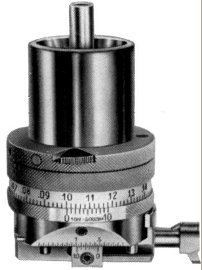 Type P1-4 (300 mm) and PI-5 (450 mm) Tilting Rotary Table with worm-and-wheel gearing. Theses units allowed the boring of holes and milling of faces to be accomplished at compound angles. Rotation angles were read to within 1 second of arc with tilt angles able to be set to within 1 minute of arc on the vernier of a lateral division circle.