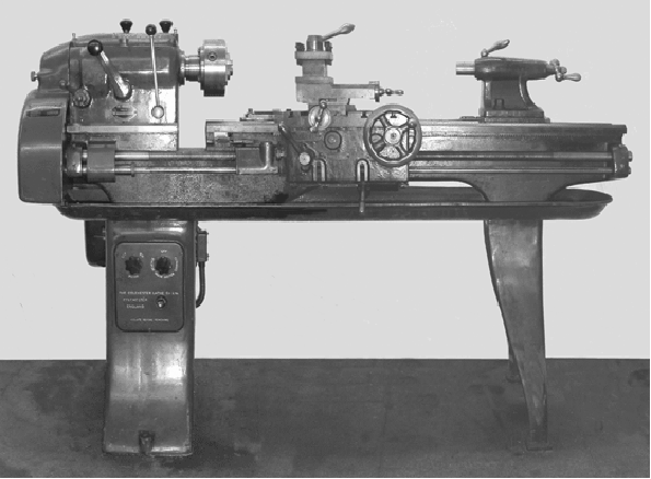 Mid 1940s to early 1950s geared-head Master on cast iron standards. Early versions of this lathe pre-dated the availability of a full screwcutting gearbox and employed a 2-speed (disengageable) drive to the leadscrew and power shaft. The changewheel guards were made in both in cast iron and cast aluminium (instead of pressed steel), and the reverse drive to the leadscrew and power shaft by an enclosed gear mechanism within the headstock with control by a lever in the bottom left-hand corner of the headstock's front face. The spindle-speed selection levers were tipped with inverted-cone plastic knobs, the spindle clutch was dropped and replaced by a spindle brake - the operating lever for which is the tall lever pivoting bottom right on the face of the headstock. Electrical controls were neatly integrated into a single plate let into the front face of the headstock-end cabinet leg - foreshadowing the even neater demountable system introduced with the full cabinet introduced in the mid 1950s.