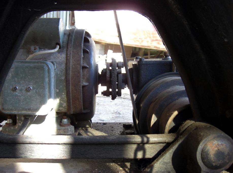 This unusual and compact drive system is fitted to an early Colchester Triumph. A motor, carrying a fabric universal joint on its shaft (as commonly employed on pre-WW2 cars) drives a standard worm-reduction right-angle gearbox. The gearbox output shaft - carrying a 3-step cone pulley - is supported in brackets with the one closest to the lathe being inside the headstock-end leg. As the leg is cast with a hole for the shaft to pass though, this assembly is almost certainly an original Colchester system..