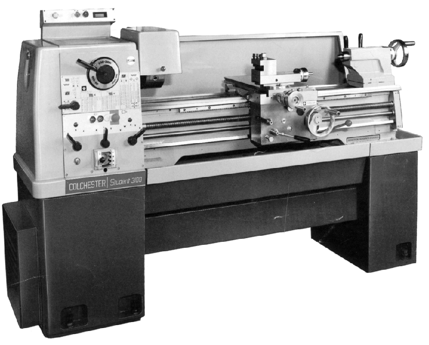 Constructed in the style of the already established and very successful 7.5-inch centre height Triumph 2000 and 8.5-inch Mascot 1600 models, the 6.5-inch (165 mm) centre height Student 3100 (together with its close cousins the Student 1800 and Master 2500), continued Colchester's traditional use of two names that had been synonymous with lathes of an almost perfect design and capacity for both training and professional workshop use since the early 1950s. As with older Student and Master model the two lathes shared the vast majority of their components and had only small but nevertheless significant differences in their specifications - all of which, in the case of the newer machines, centred on the headstock and drive system. The expensive Student 3100 was intended to fill the niche vacated by the long-serving 3000 rpm variable-speed "Chipmaster", a machine that proved so popular its production was continued until 1983. Unfortunately, the appeal of the tough little Chipmaster had always been restricted by its limited capacity: a centre height of 5.5 inches and a capacity between centres of just 20 inches made it suitable only for the smaller tasks in a commercial workshop. The "3100" was designed to overcome these limitations and was not only much larger but fitted with an improved and more reliable variable-speed drive system that employed three "geared" speed ranges; these ranges allowed seamless bands of speeds to be selected between 20 to 120 rpm, 90 to 540 r.p.m. and 500 to 3100 r.p.m. and also ensured that a great amount of torque was available at the slower revolutions. Claimed by the makers to be "maintenance-free" a pair of expanding and contracting pulleys generated the variable-speed changes while a simple gear set within the headstock delivered the fixed speed ranges. The speeds were caused to change by push buttons that activated (limit-switch protected) motors driving threaded rods that caused the pulleys to be moved closer together or further apart - with the "geared ranges" engaged by a single handle integral with a large dial on the face of the headstock. A digital speed display was fitted to the headstock. Because of the high top speed, and the lathe's ability to mount very large jobs, the makers warned against the use of other than the dynamically balanced, ductile-iron chucks with hardened scrolls that had been specially commissioned from Burnerd; if a new chuck is required on these lathes it would be unwise to fit anything other than one recommended by a reputable Western manufacturer. You are welcome to email for details of quality replacements that we can recommend. Once the motor had been switched on by a headstock-mounted push-button starter the starting and stopping of the spindle was by a single lever pivoted from the right-hand apron wall and working through a 'third shaft' (parallel and below the feed shaft and leadscrew) and connected by links to a cross shaft that passed through the bed just in front of the headstock. Although the lathe was capable of rotating heavy jobs at high speed it was not possible, because of the variable-speed drive system, to fit the same sort of powerful spindle brake that was used on the otherwise very similar Student 1800 and Master 2500 Models. The lathe was, however, fitted with an automatic "fail safe" brake that had a manual release button. Also included was a headstock-mounted emergency-stop button that operated through the obligatory "no-volt" release (to prevent the motor restarting after a power cut) and a motor-run warning light to alert the hard-of-hearing, or those working in a noisy environment, that things were "active" and the controls should not be played with casually. The rest of the machine was identical to the ordinary Student 1800 and all the accessories for that lathe, and the Master 2500, were identical. 9.5-inch (230mm) wide, the bed was induction hardened and ground-finished as standard; it was of the usual Colchester V-and-flat type with separate pairs of ways for the carriage and tailstock. It was available in two lengths that gave either 25 or 40 inches (635 mm and 1000 mm) between centres but wisely could not, because of its size and very high top speed, be ordered with a gap. The headstock gears were lubricated by oil splash, from a supply within the base, with the system improved by the fitting of a "distributor tray" in the roof of the headstock that collected the flung up oil and fed it though pipes to ensure that it reached the right places; the same oil was fed, unfiltered, to the "Gamet Super Precision", pre-loaded and self-adjusting taper roller bearings. The 1.625" (40 mm) bore, 4-in D1 Cam Lock nose spindle was especially rigid and had been designed in conjunction with the British Machine Tool Industry Research Association. Continued below: