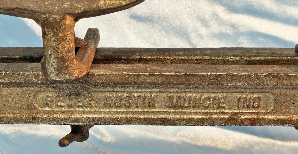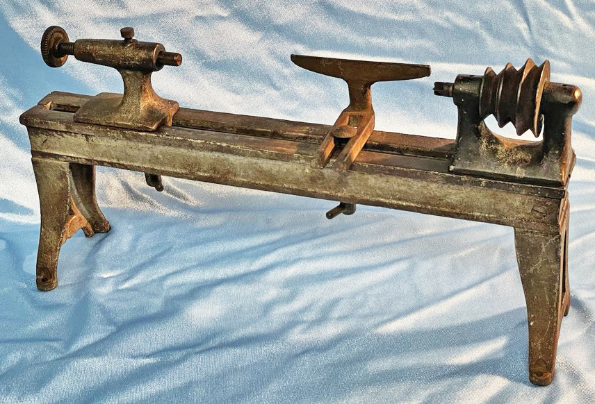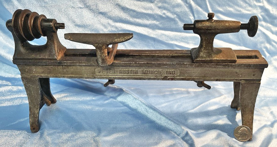 Made in or marketed from the town of Muncie in Indiana - it's not clear if Peter Austin was a manufacturer or just a reseller who had commissioned a local engineering company to make the lathe for him. Very small - just 13 5/8" long and 3.375" wide and weighing either 5 lbs (or 10 lbs packed for shipping) - the lathe was intended for only the lightest of tasks and, for just $3, was, of course, supplied without a motor or drive system. With a centre height of just 11/2", it was limited to turning a piece of wood up to three inches in diameter and eight inches long. Advertised for only two years with tiny entries during 1917 in the "Popular Science" magazine for July, September, October and December and, in 1918, in July, August, September, October and November. Other entries, in the "Popular Mechanics" magazine of 1917, were in April, May, June, August, September, October and November..