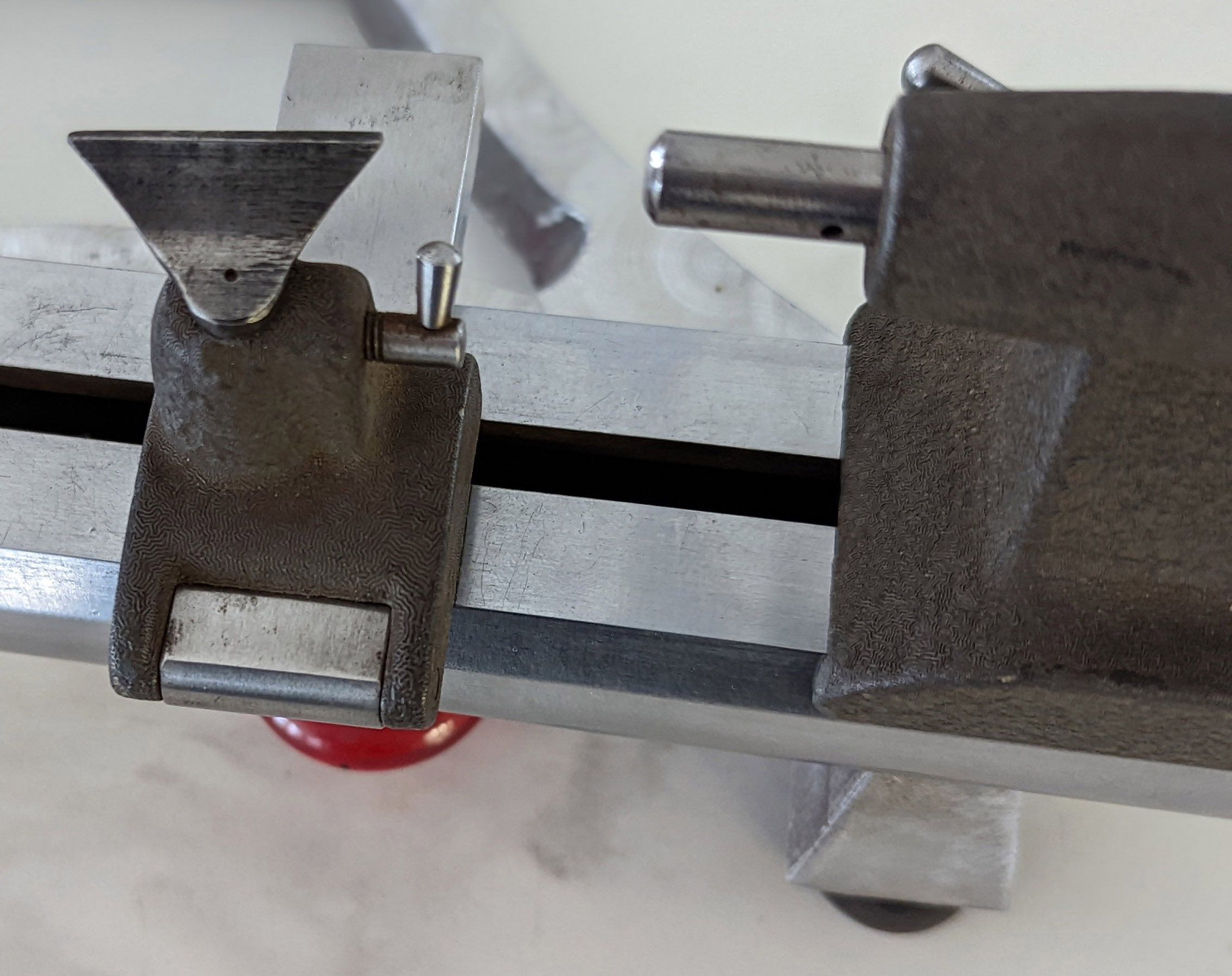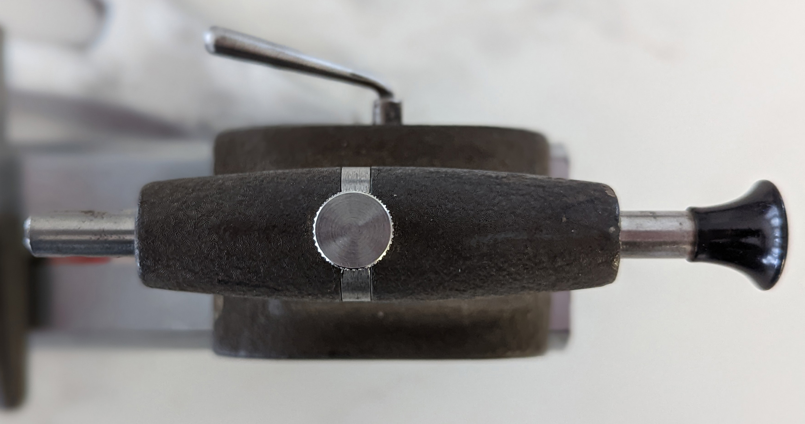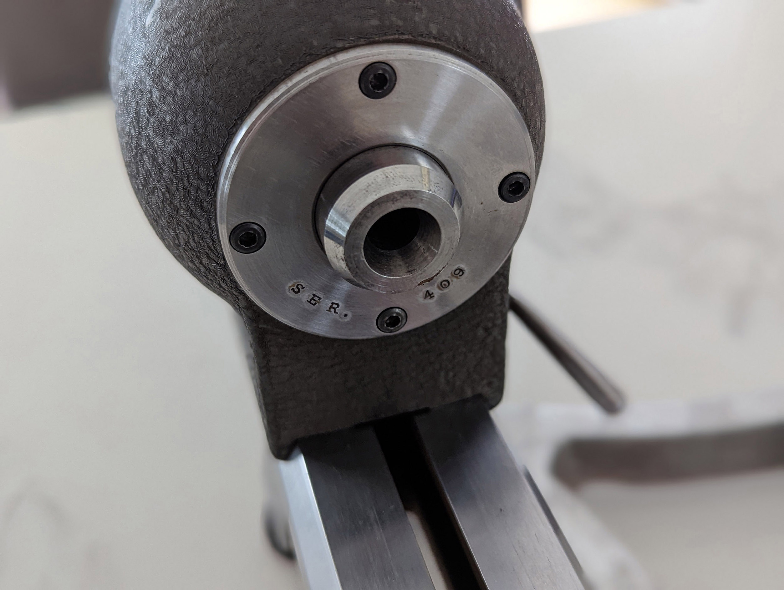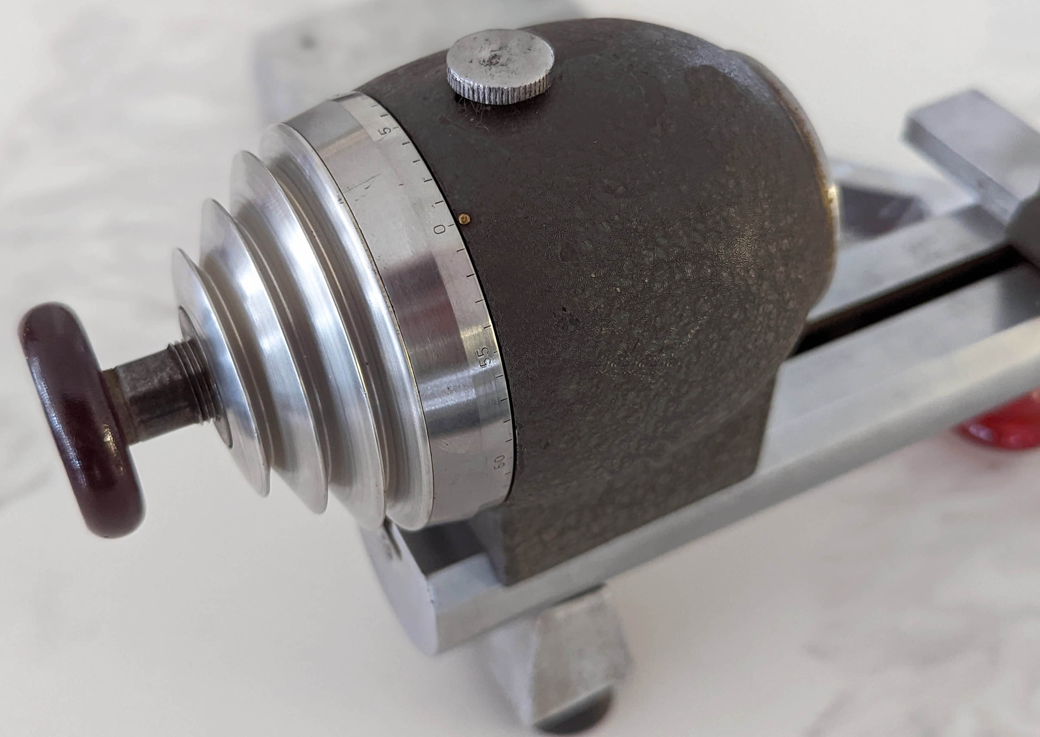 The distinctive Post WW-2 Rivett Model R1 watchmakers' lathe as manufactured by the then Rivett Lathe & Grinder Corporation. Approximately 500 to 600 examples were made from 1946 to around 1950 - all fitted with a headstock spindle running in ball races. The use of anti-friction bearings in watchmakers' lathes was not unusual, examples being made by, amongst others, Levin, Coronet, Derbyshire, and Marshall. The large pedestal beneath the headstock is usually found in cast aluminium - but slimmer ones in cast iron were also produced. If you have an R1, especially one with accessories, the writer would appreciate pictures to add to the Archive