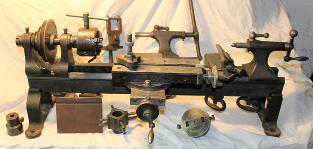 An early C.H.Joyce lathe, probably circa 1890 to 1910. The lathe has survived complete with a number of original fittings including headstock bearing oilers, both screw-feed and lever-action tailstocks, a rather fine 2-jaw chuck, a box chuck with 6 radial screws, a fixed steady of typical 19th century design, a saw table and a hand T-rest. The micrometer dials are a later fitting.