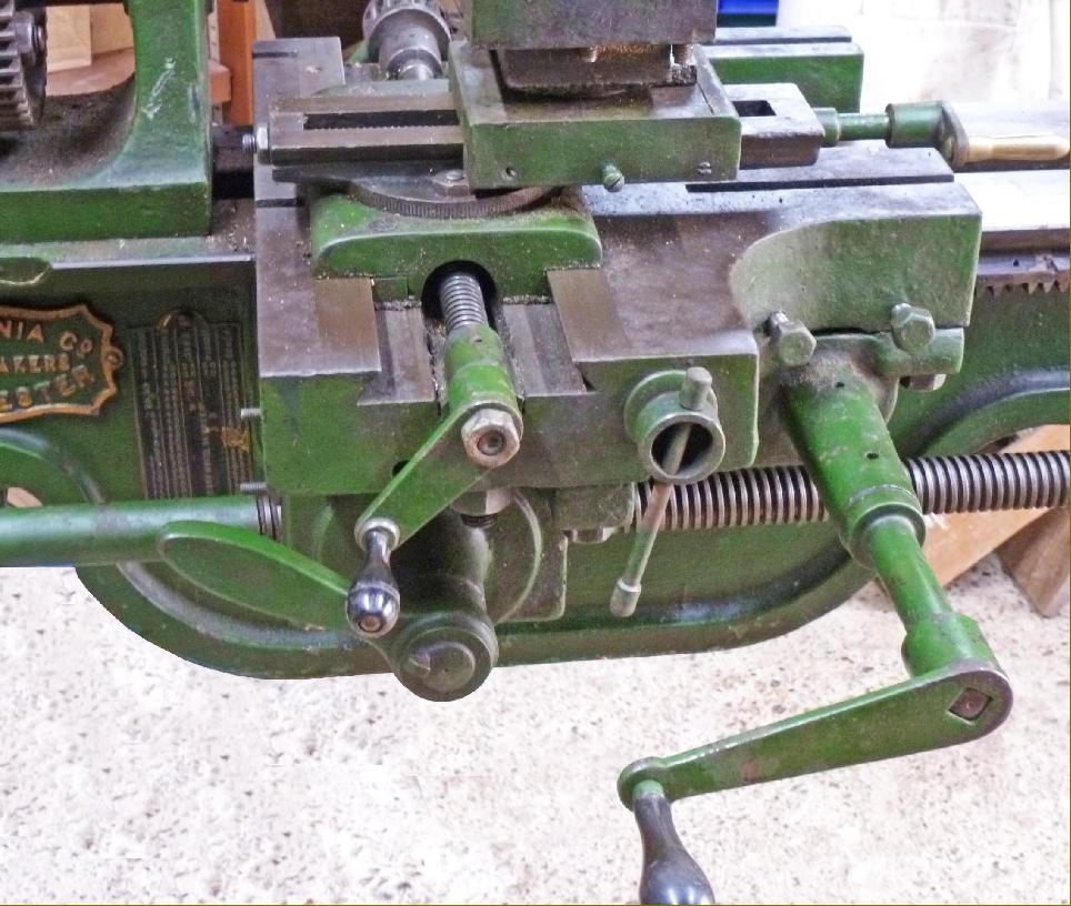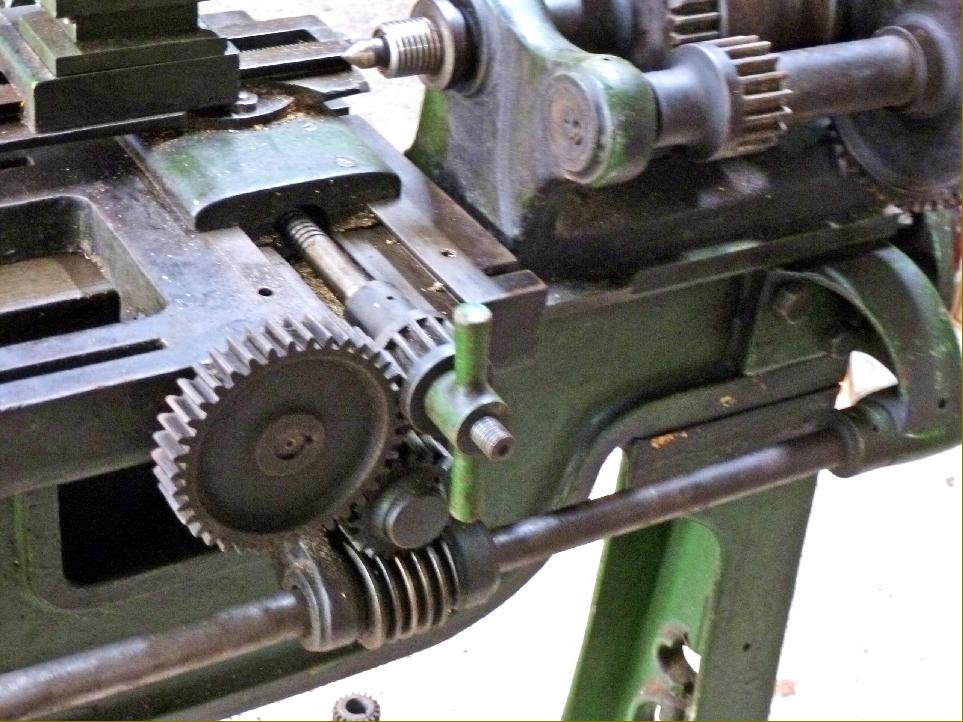 Rear view of the Britannia power sliding and surfacing feed mechanism. The power cross feed was engaged by the T-handle