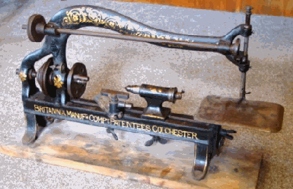 Britannia Lathes 8 &13 Recognisable by its distinctive tailstock, possibly unique to the model, the No. 8 Britannia lathe was numbered out of Model sequence - being designed to fit between the No. 3 and No. 4 machines. The centre height was 3.5 inches and the capacity between centres 16.5". It was intended only for light, amateur use, but even so the 5/8" Whitworth threaded headstock spindle was hardened, as were the bearings it ran in. The lathe was supplied complete on a cast-iron stand with a rear-mounted wooden tool tray and was delivered ready to run with steel headstock and tailstock centres, a hand rest with 2 Tees, a wrought-iron crankshaft and treadle (that was supported on hard-steel centres instead of running in bearings), a turned-finish flywheel, driver and drill chucks - and a leather driving cord. The weight was 180 lbs and the cost, at the turn of the century, £6 : 10s or, with a 3-foot bed, £7. A screw-feed compound slide rest was an extra £3 - an astonishing sum in comparison with the lathe's basic price.