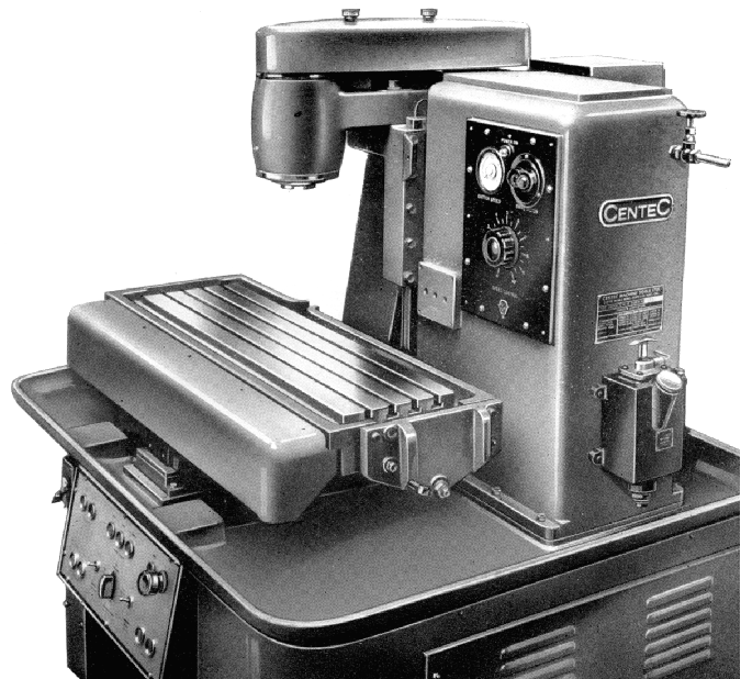 Centec 3P. This model was of similar construction and configuration to the Centec 3 and 3R but fitted with a mechanism whereby the height of the cutter above the table was continuously controlled by a template and tracer valve. Shapes with angles up to 80-degrees from the horizontal, and very slow tapers, could be accurately copied without steps.