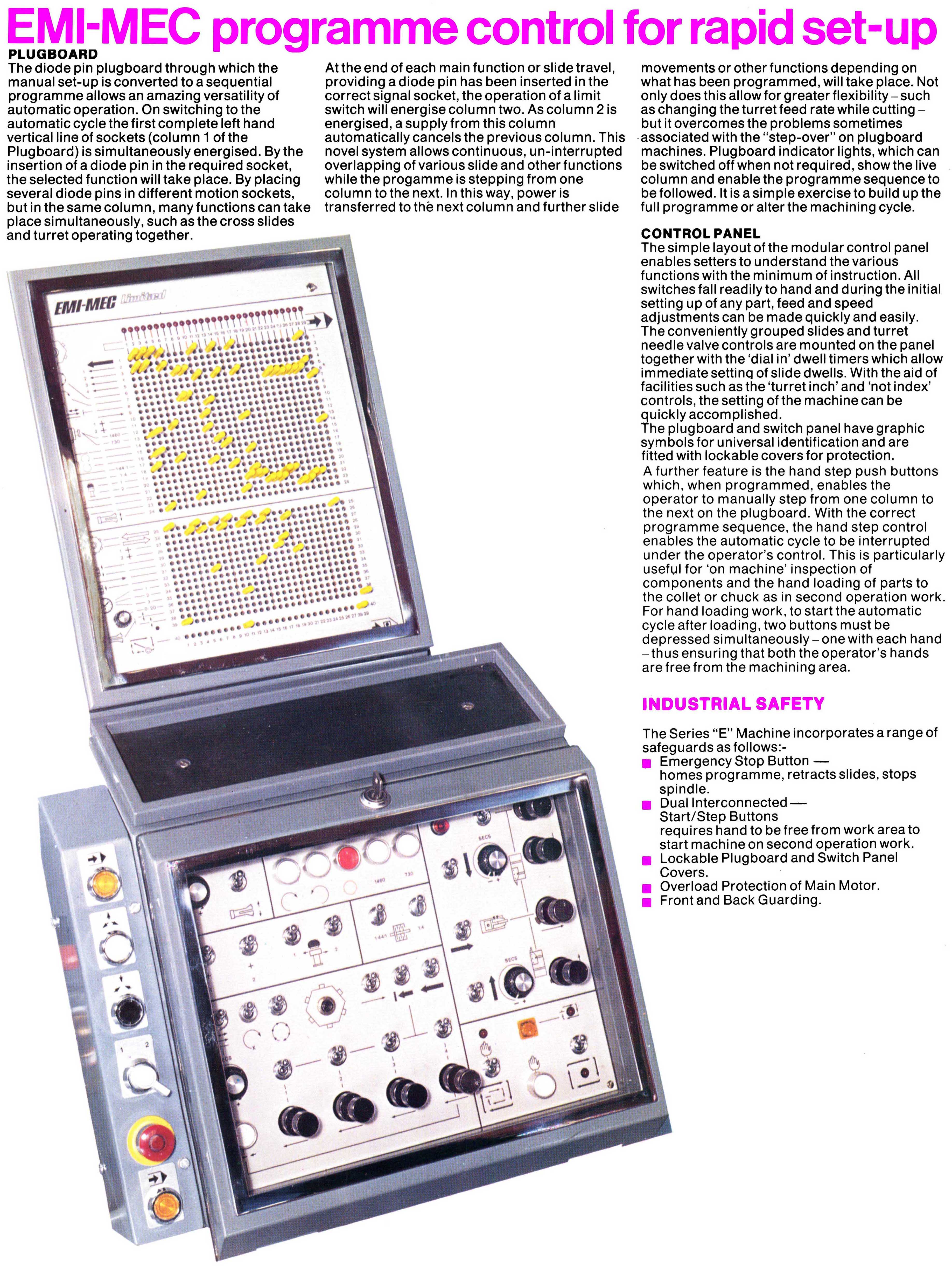Manufactured by a branch of the EMI Organisation the MEC Sprint single-spindle capstan lathes were described as P.S.C machines i.e. Program Sequence Controlled. The result of a three-year development programme during the early 1970s, by late in that decade some 10,00 examples where is use worldwide. Like many such "automatic" machines from that era, control was by plug boards, an essentially simple system that allowed relatively inexperience operators to work the machines.