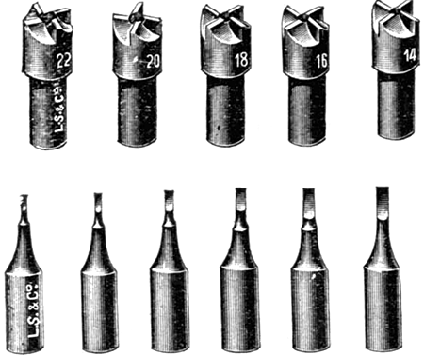 Lever-action tailstock fittings with tapered shanks: top row - Pin Cutters bottom row - Flat Countersinks. Both were sold in sets of 20.