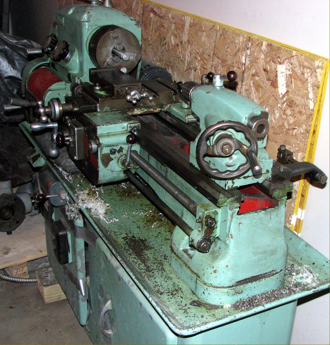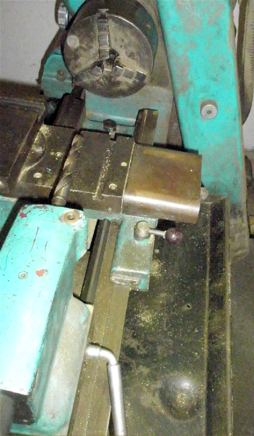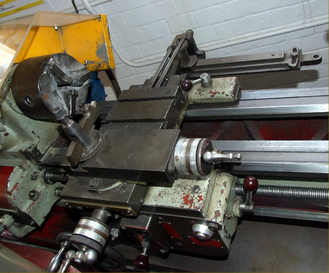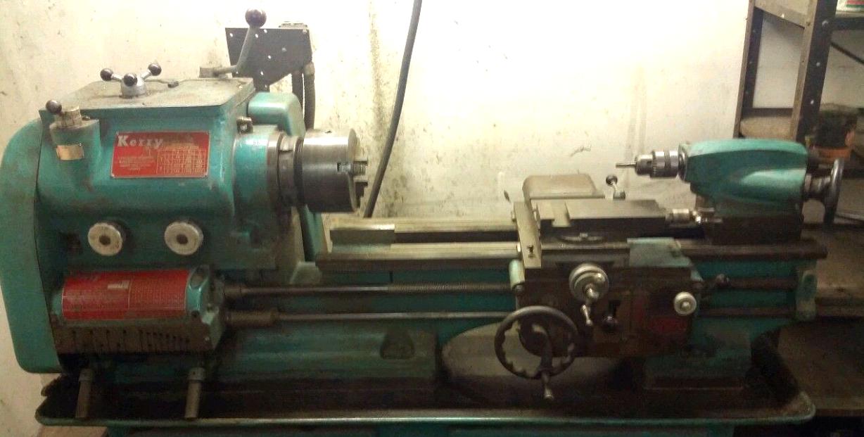 Continued: Kerry Mk. 1 A.G. lathe with a single rotary control on the apron to both select and then engage the power sliding and surfacing feeds. The leadscrew clasp nut lever was on the front face of the apron. Note the small headstock spindle speed-control dials Continued: For a 5.5" lathe the bed (for which, at first ,there was no option of a gap) was of massive proportions, heavily ribbed between the walls and carrying a Vee and flat for the saddle and another Vee and flat for the No. 3 Morse taper tailstock - of which some, produced during the late 1950s and 1960s, were fitted with a rack-driven spindle operated through an angled drive with bevel gears. A full screwcutting gearbox, which generated 62 English pitches, was supplied as standard, its changewheel drive from the headstock incorporating a tumble-reverse mechanism. On early lathes the changewheels have been measured as 16DP with a 14.5-degree pressure angle but later examples (reflecting general changes in industry standards) have been found with 18DP gears and a 20-degree pressure angle. Metric threading was also possible, the full range of 60 pitches being obtained by the substitution of three changewheels in the drive train. Used only for screwcutting the leadscrew could be disengaged when not in use. A separate power shaft took a drive from the gearbox to the apron where the power sliding and surfacing feeds were (on all but early machines) selected and engaged by just a single lever flicked easily and conveniently though a vertical "gate"; interestingly, this design was copied and used by Taiwanese manufacturers on certain of their 6" centre-height lathes as well as a development of it by Emco on their well-known V10 and V10P machines. Sliding power feeds ranged, in geometrical progression, from a low of 0.000375" to high of 0.24" of carriage travel per single revolution of the spindle. The compound slide rest was especially well built and the wide cross slide equipped with useful T slots. Of course, at first, the micrometer dials were far too small but once the Mk. 2 was in production the size of the cross-feed dial was substantially increased. The Kerry lathe appears to have been built in four distinct forms: the early, very rare and quite different belt-drive Model D.B, the popular Model A.G. (in what, for convenience if unofficial reference, we shall call the Mk. 1, Mk. 2, Mk. 3 and Mk. 4 forms) and what might be described as the Mk. 5 , the widely-exported Models 1124 and 1140. While all versions of the AG were similar and based directly on the Mk. 1 (but with modified aprons and tailstocks), the 1100/1200-series was extensively redesigned, looked very much more modern and was available in both 11" and 13" versions. Although they shared many parts the main difference between the three AG lathes was the apron - this item obviously being a point of some difficulty for the Kerry design department who seemed determined that both selection and engagement of the power sliding and surfacing feeds would required only one easy-to-move control instead of the usual two. Their first effort, on the Mk. 1, saw a rotary dial positioned in the front left-hand corner of the apron with the leadscrew clasp nuts operated by a lever in the bottom right-hand corner and the carriage handwheel placed high up and to the right. On the Mk. 2 (a lathe that has sometimes, along with the Mk. 3 been found badged as either the "G.C." or "A.C.") the dial was replaced by a lever moving vertically in a slot cut into the centre face of the apron, with the clasp nuts operated by a lever fixed to the apron's right-hand face. It is not known what problems the first two designs encountered (though the power-feed lever had a horrible feel) but to what must have been the department's great relief the final Mk. 3 apron proved entirely successful. This version, which used a lever moving vertically, then sideways through a dog-leg gate, allowed either sliding or surfacing feeds to be instantly selected and then positively engaged. Very early versions of the Mk. 3 can be identified by the lack of the Kerry logo and absence of a power-feed safety overload clutch. One final, rather odd type has recently (2014) come to light - what we will call, for convenience, the Mk. 4 version of the "A.G., A.C. and G.C." Series. What was written on the maker's identification plate is unknown but the lathe had a very different headstock casting with a 3-spoke handle on the top and a second lever mounted on the front face on the top of a cast-in boss. The speed range was marked as being a very useful 40 to 2000 r.p.m. If you have a Kerry like this the writer would be interested to hear from you. A weak point on early Kerry lathes was the operating mechanism of the spindle cone-clutch (the clutch itself was fine) with its effectiveness deteriorating over time. Although the clutch mechanism might have changed or been modified on later models, on many examples the fault can be corrected by modifying the arrangement to limit end float in the assembly. At the front the shaft ran in a ball bearing retained by what amounted to a motor-car cylinder block core plug; after time, the plug tended to loosen, allowing the bearing, complete with shaft and clutch, to float from side. Although the float was limited internally by other constraints, the 1/8" play generated was sufficient to cause problems. The cure is to replace the core plug with a top-hat section, bolt-on cap, arranged so that when it fits into the bore it holds the bearing tight against the rear flange. A cap made from aluminium, and held by 3 1/4" bolts is sufficient. However, as a temporary repair, the clutch can be locked up by the twist of an Allen key, so the fault did not need to spoil what was otherwise an excellent lathe. If the markings are missing from the headstock speed-selector dials - take care, it is possible to rotate them into positions where they can interlock. To check this remove the headstock cover, turn 