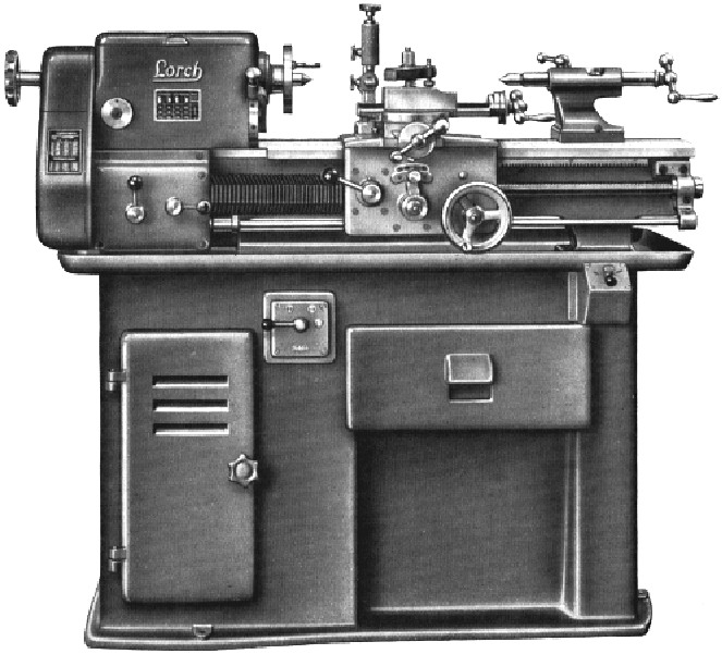 A development of the long-established Lorch Model C11 (a type open marketed using the name Lorch Schmidt), the 6" centre height by 40" between centres D27 "Precision Leadscrew Lathe" was one of heaviest-ever Lorch lathes; tipping the scales at 670 kg it was built on a traditional style of open cast-iron stand with a stout pedestal beneath the headstock and the 2-speed motor mounted at the back on an adjustable plate. A cast-iron chip tray, with a single central tool drawer, ran the full length of the non-gap bed ways. The motor drove downwards to an enclosed countershaft - the drive then being transmitted upwards through the pedestal leg by a flat belt to the headstock. Arranged with three Vees and one flat the bed ways were arranged, in the usual manner, so that the saddle and tailstock were each guided and aligned on separate surfaces. Bored through 11/16", the headstock spindle was made from high-quality steel and hardened on its bearing surfaces and nose; it ran in adjustable bronze bearings and was supplied with oil, lifted by felt strips, from cast-in reservoirs situated beneath the spindle line. The 7 : 1 ratio backgear was clustered just behind the front bearing (just like a Myford ML7) with both gears rotating on a shaft below the spindle and its engagement lever positioned just behind the spindle nose. A two-speed electric motor was fitted with the option of ordering normal or "high-speed" versions. The ordinary motor fitted gave spindle speeds of: 41, 66, 82 and 132 rpm in backgear and 285, 465, 570 and 930 r.p.m. in direct drive With the high-speed option fitted speeds were exactly doubled and became: 82, 132, 164, 264 in backgear and 570, 930, 1140 and 1860 r.p.m. in direct drive Made to the highest possible standards of accuracy, the 5 mm pitch leadscrew was driven not by a full screwcutting gearbox - but though an ordinary tumble reverse mechanism, changewheels and a simple gearbox that gave three sliding and surfacing speeds (and threads) for each setting of the gears. However, a separate power shaft was fitted and, in normal use with the leadscrew disengaged, the sliding and surfacing feeds were driven by that. A third shaft, parallel and below the powershaft was used to transmit movements of a motor-control lever bracketed to the right-hand side of the apron; this allowed the operator to stop, start and reverse the machine without having to reach back to the headstock. The lever moved in a horizontal plane and was spring loaded to its central position..