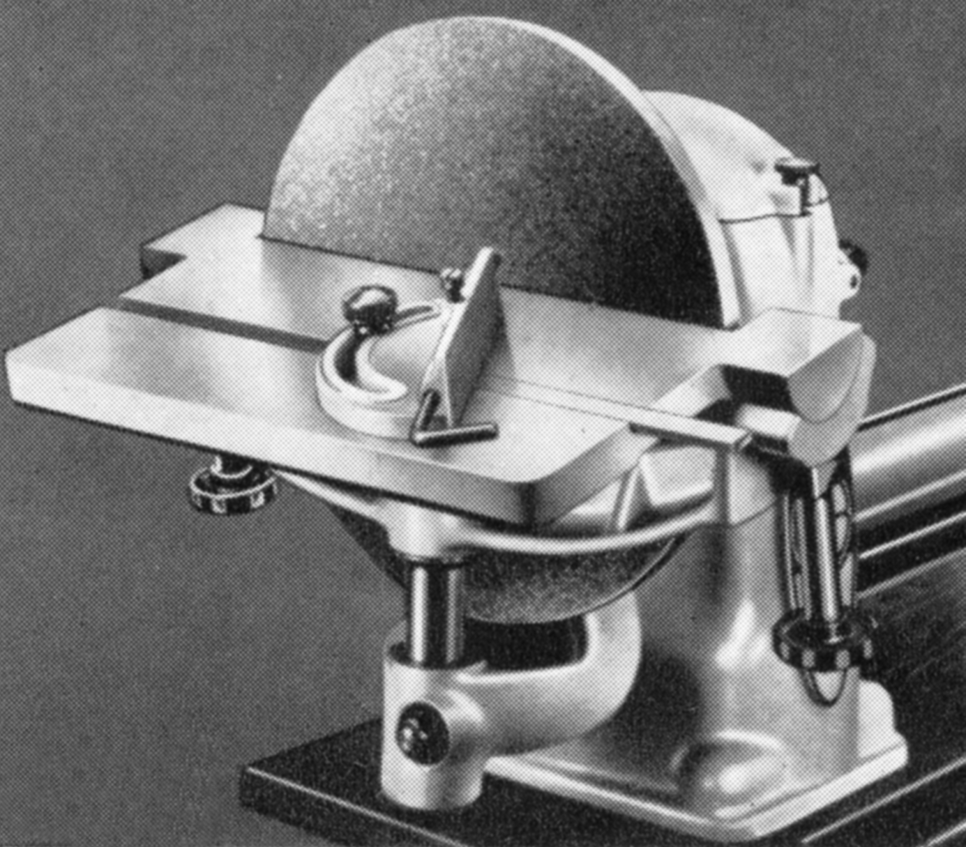 Running in angular-contact ball bearings, the No. 1 Morse taper, 13/32" bore ground-finish headstock spindle was held inside a headstock (with a simple lift-off cover) and carried a 4-step, A-section V-pulley with a ring of 24 holes to assist in dividing and marking out; the nose thread was 1" x 12 t.p.i on the right-hand side and 7/8" x 12 t.p.i on the left-hand outboard bowl-turning end. Unusually for an amateur's wood lathe, the spindle was provided with proper registers behind the threads to allow the accurate fitting of metal-working chucks and heavier faceplates. The 1425 rpm motor (0.5 hp 3-phase or 0/5 h.p and 0.75 hp 1-phase) was carried on a countershaft unit mounted underneath the lathe on a specially constructed, adjustable plate and drove upwards to the headstock spindle by a single single "link" V-belt than can be ordered here. The countershaft was designed to fit either the maker's stand or beneath a customer's own bench. Four speeds were available: 700, 1140, 1780 and 2850 rpm.