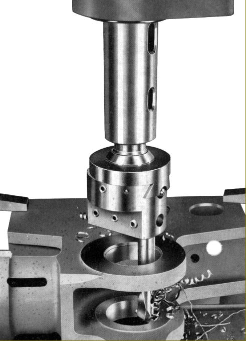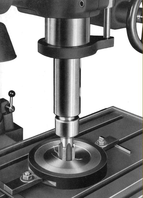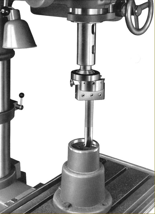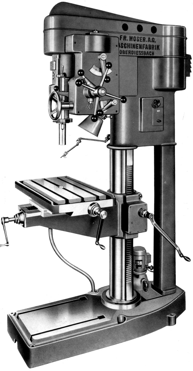 Manufactured in Switzerland, the BD-40E co-ordinate-table, double-column knee-type drilling machine was a product of S.A.Fritz Moser Ltd. of Oberdiessback, near Berne. During the 1940s and 1950s Moser offered as many as thirteen models of drill with capacities in steel from 13 to 50 mm (0.5 to 2-inch). The BD-40 (in production during the early 1950s) was intended as a general-purpose machine with a range of speeds and a capacity that allowed a wide range of ordinary workshop tasks to be carried out including tapping, precision boring, reaming and light milling operations. A heavy machine - it weighed close to one ton and was capable of drilling holes up to 40 mm in diameter under continuous operation - the BD-40E had a hollow main column in steel braced by a second column at the rear that added a great deal of rigidity. Mk. 1 models, built up to an unconfirmed date - but thought to have been 1952 - had a main column 160 mm in diameter while the later Mk. 2 version (with some dimensional and capacity changes) had this increased to 170 mm. Built into the ventilated head casting was a 3-phase motor running at either 960 or 1450 r.p.m. with the drive passing, by V-belt, to a 6-speed gearbox. Instead of the expected and simple splash lubrication system one might have expected, the box was fitted with a pressure oil feed from a pump mounted on the drive spindle with the lubricant level and its circulation visible through a sight glass. When fitted with the slower motor the six spindle speeds were 40, 88, 163, 208, 470 and 820 r.p.m. and, with the faster, 62, 130, 245, 328, 693 and 1255 r.p.m. The makers also offered, at extra cost, a 2-speed pole change motor that gave the full 12-speed range from 40 to 1255 r.p.m. Made from a heat-treated and ground chrome-nickel steel, the 35 mm diameter spindle ran in high-precision, adjustable taper roller and radial bearings. Normally supplied with a No. 4 Morse taper nose, customers could also (though probably unwisely) choose from others as well. With a diameter of 90 mm, the quill had a travel of 180 mm by both hand and power, the former using a 4-arm capstan handle for normal feeds and by a handwheel working through worm-and-wheel gearing for fine. Driven from the main spindle drive by spur gears, the four rates of power down-feed were 0.10. 0.15. 0.20 and 0.25 mm/rev - these figures being changed on late models to 0.07, 0.10. 0.20 and 0.40 mm/rev. Fitted as standard was a depth drilling scale connected to an automatic disengage for the power down feed. Two tables were offered, the Type KT, a rugged rectangular type with a clamping area of 650 x 300 mm and a feed longitudinally of 500 mm and in traverse 275 mm (increased to 340 mm on the Mk. 2). Feed screws and dials were metric as standard, the micrometer graduations reading to 0.10 mm. The other table, Type UT, was a "Universal" rectangular type with a clamping area of 450 x 400 mm; this did not have a screw-driven travel but was mounted on 340 mm long prismatic guides along which it could be slid by hand towards and away from the column and also swivelled through 180° each side of central. Both tables were carried on the same knee assembly, this able to be swung around the column and lifted and lowered by rack-and-pinion gearing connected to a long crank handle. With the table lowered as far as possible a maximum clearance of 750 mm was available between it and the spindle nose and, when swung out of the way to expose the T-slotted baseplate with its 500 x 400 mm clamping surface, a clearance of 1140 mm. On Mk. 1 models the throat (spindle axis to the inside of the column) was 360 mm and a more useful 405 mm on the Mk. 2. Overall dimensions of the Mk. 1 were, approximately, 1350 mm deep front to back, 900 mm wide and 2100 mm tall and, on the Mk. 2, 1470, 900 and 2115 mm respectively..