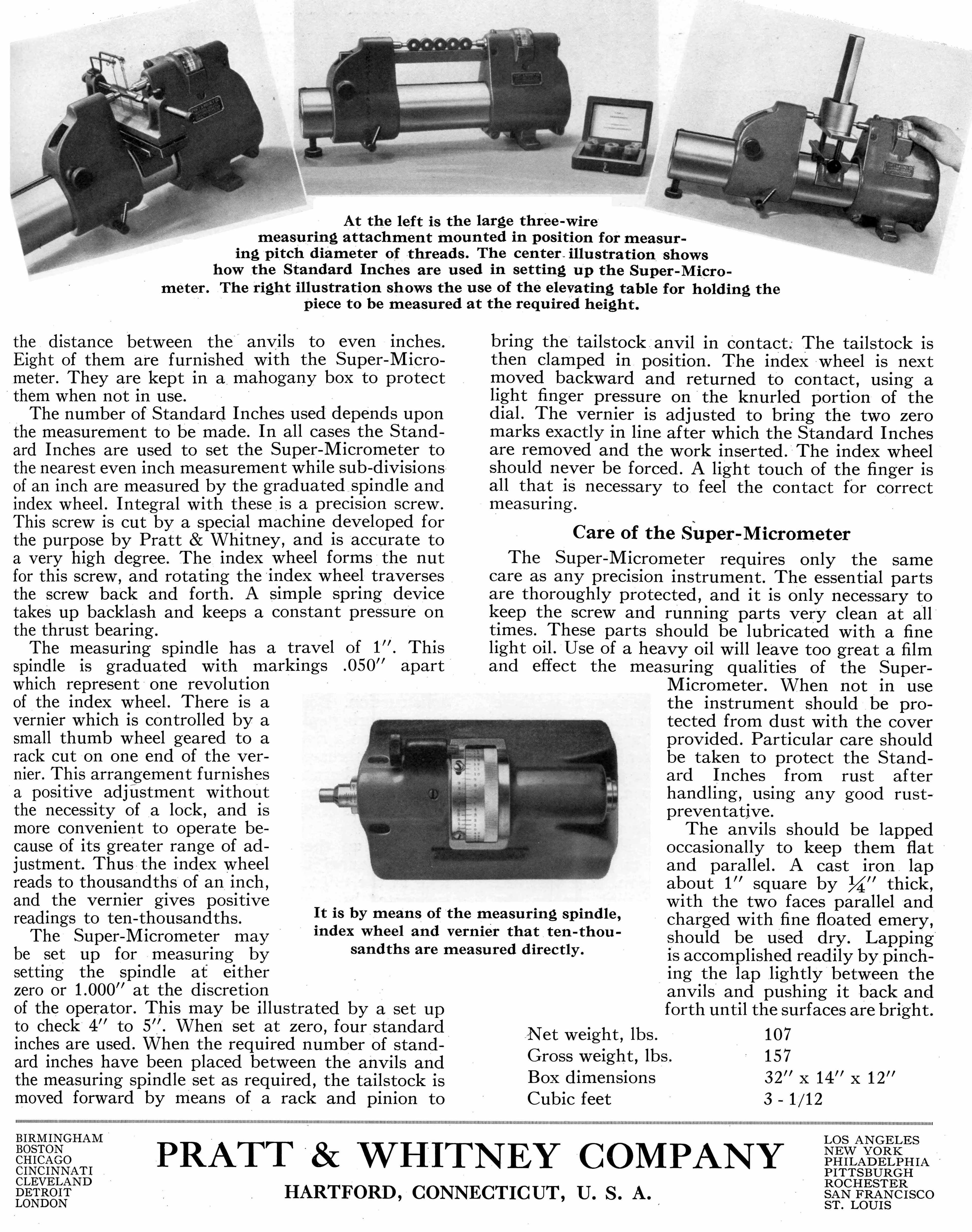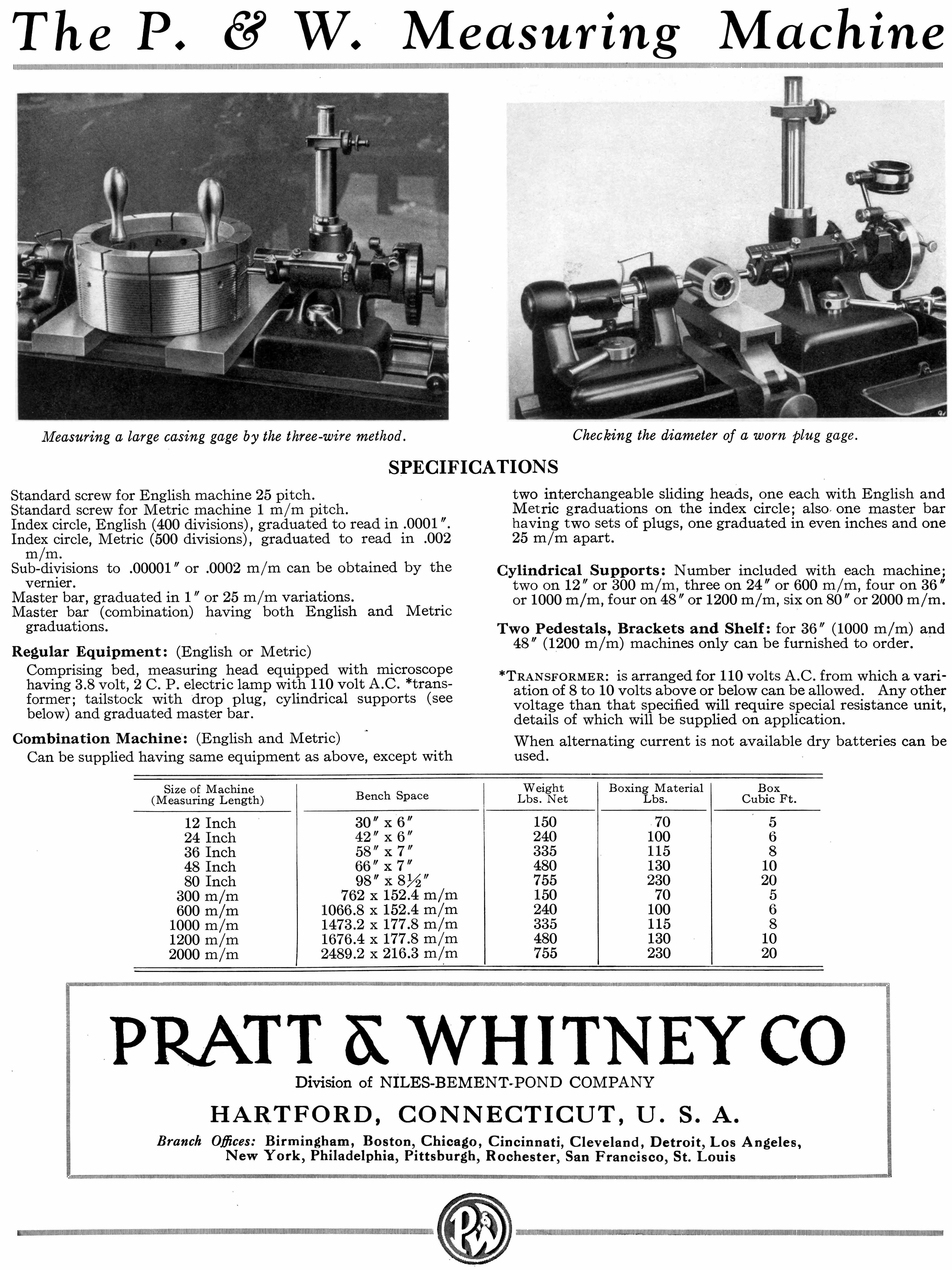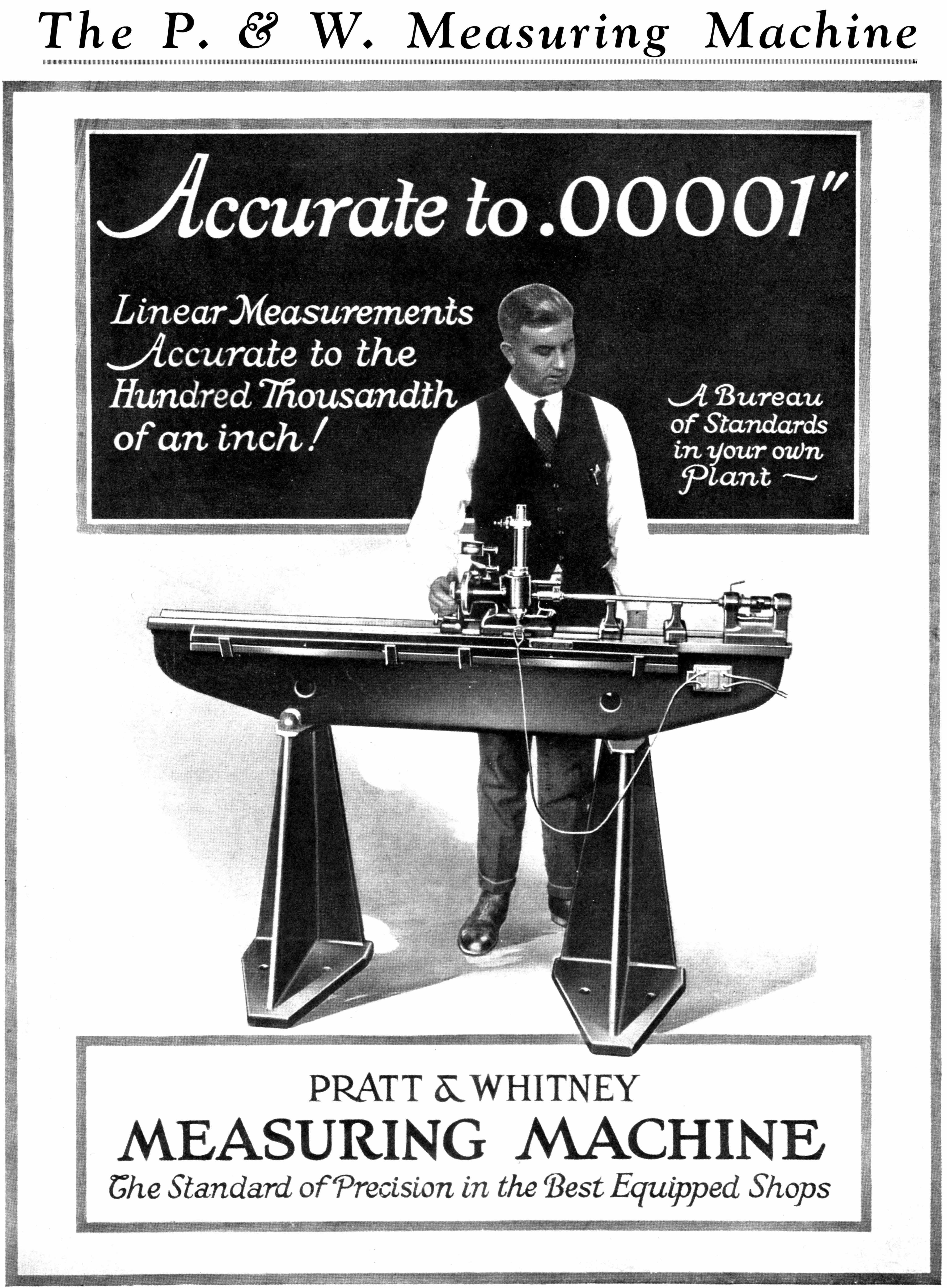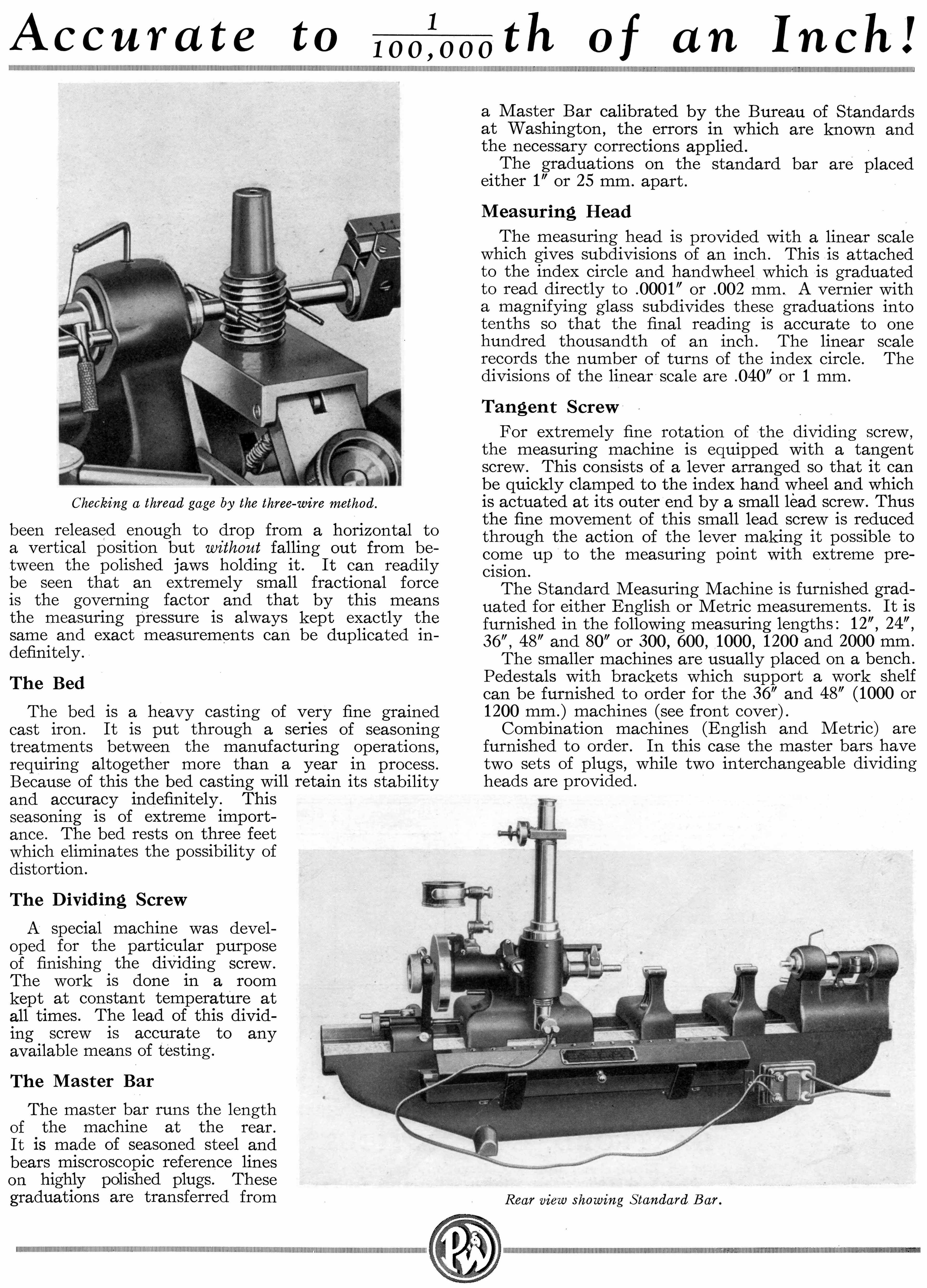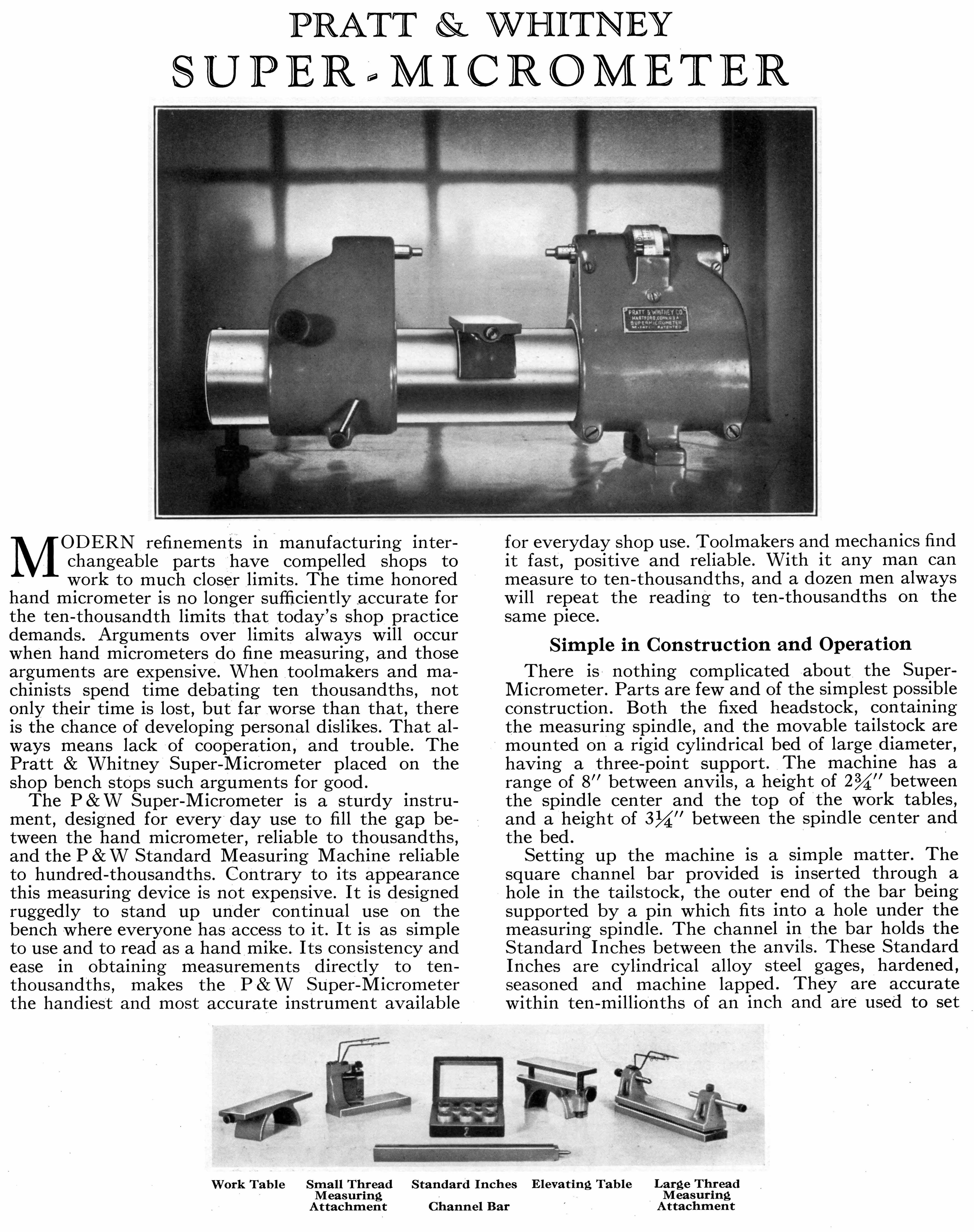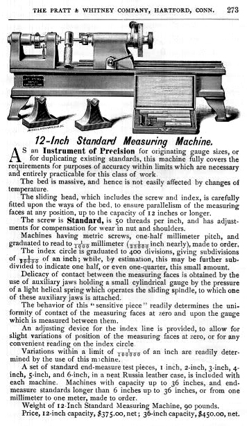 Advertised in the forms shown below during the 1920s and 1930s, and similar in design to other high-precision measuring machines made by the likes of Société Genevoise d'Instruments de Physique (SIP) in Switzerland, the P & W Precision Measuring Machine was intended for checking tolerances to within 1/100,000" (0.00001"). The unit was first made available in the 1890s and is shown, near the bottom of this page, in the maker's catalogue for 1889 (highly collectable, these sales publications contain an almost unbelievably wide range of machine tools and measuring and inspection equipment). Manufactured in a number of models that could measure lengths of 12, 24, 36, 48 and 80 inches, the Precision Measuring Machine and would have been made to virtually the same standard as those supplied to the American Bureau of Standards and as well as similar organisations that existing in all advanced countries. Needless to say, in order to produce accurate results, the machine was best housed in a temperature-controlled and preferably vibration-resistant room and handled only by trained personal. Like the "Lord Chancellor" microscope designed and built by the famous English engineer Henry Maudsley in the early 19th century - and the subsequent types manufactured by Joseph Whitworth in the 1840s - the bench-mounted "Super Micrometer" by Pratt & Whitney was intended as the final arbiter of standard in a large toolroom. The catalogues below give a clear description of the two machines with their construction and operation fully described.
