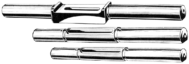 Steiner beds: at the top the heavy No. 4 lathe bed that was 10.25 inches (260 mm) long; in the middle the No. 4a bed 91/2 inches (241 mm) in length and 1 lb in weight and at the bottom the No. 4b bed (85/8 inches (219 mm) long and weighing 12 ozs.