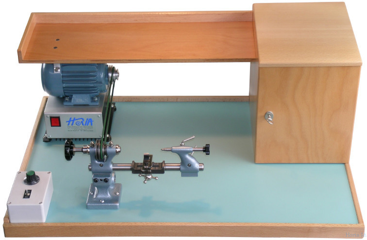 Horia TH40 Watchmaker's lathe with motor, baseboard, upper tool tray and 4 drawers for the tools. Also included is a 220-380 0.09 kW, 50 Hz, motor in an IP54 enclosure driven by a frequency inverter to give infinitely variable speeds