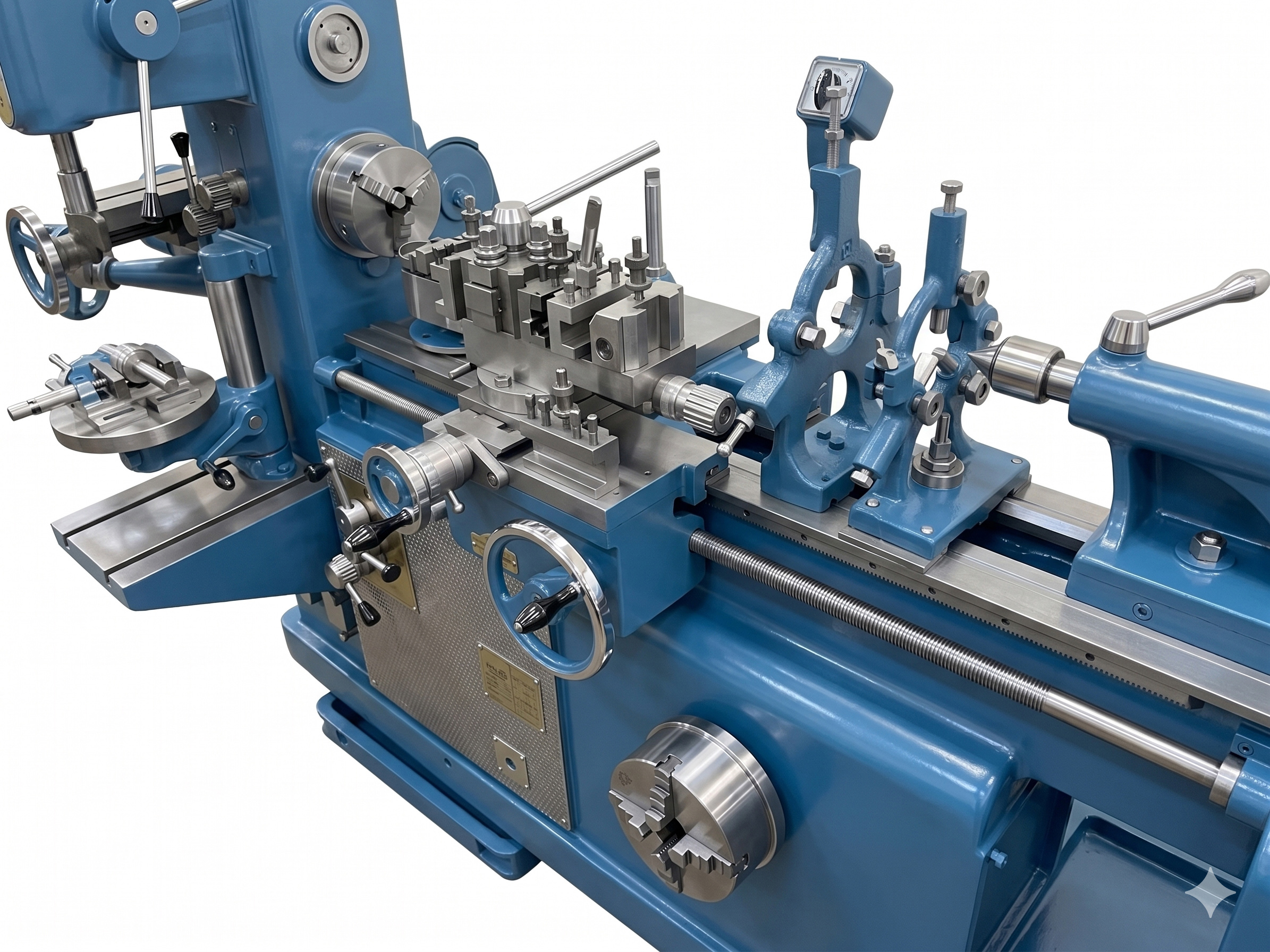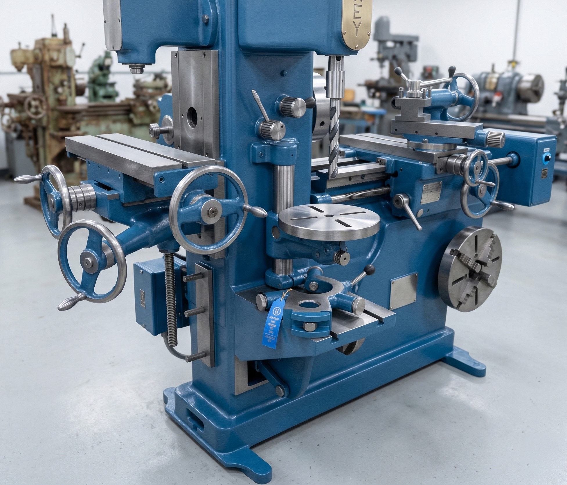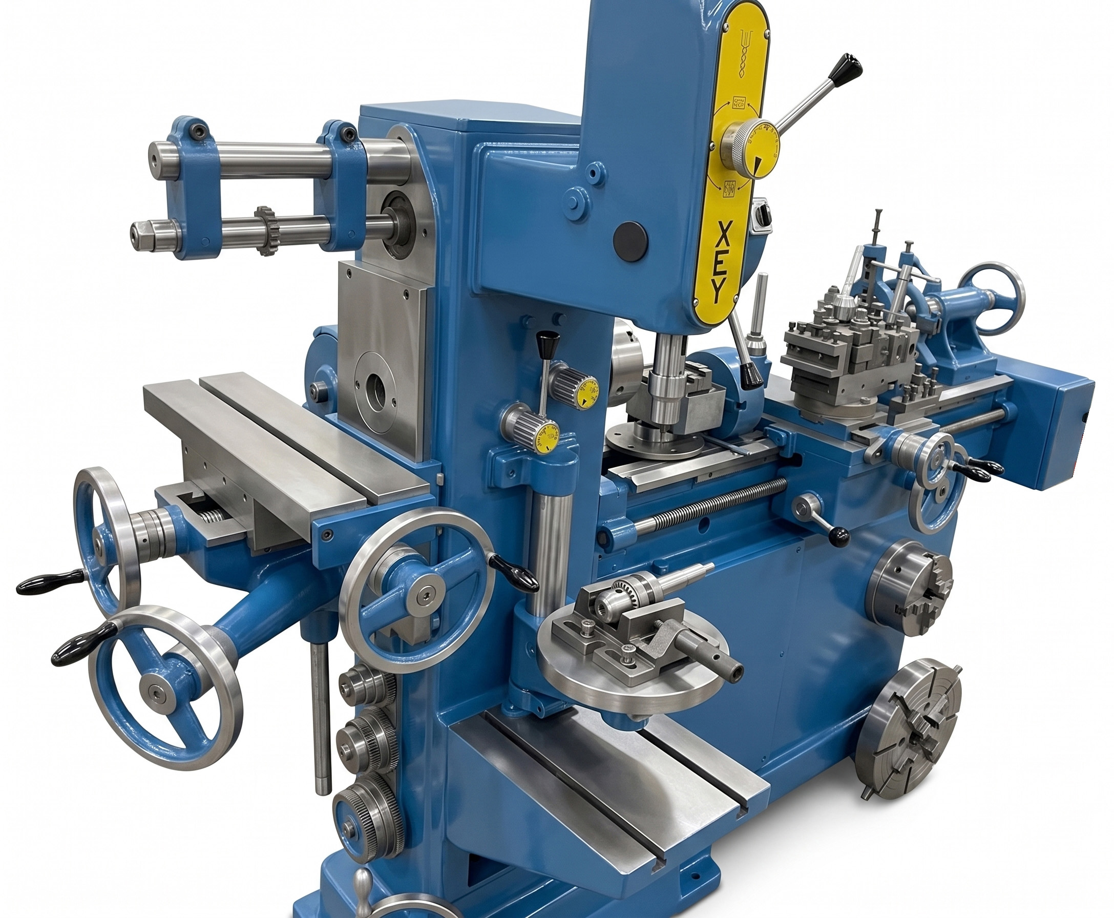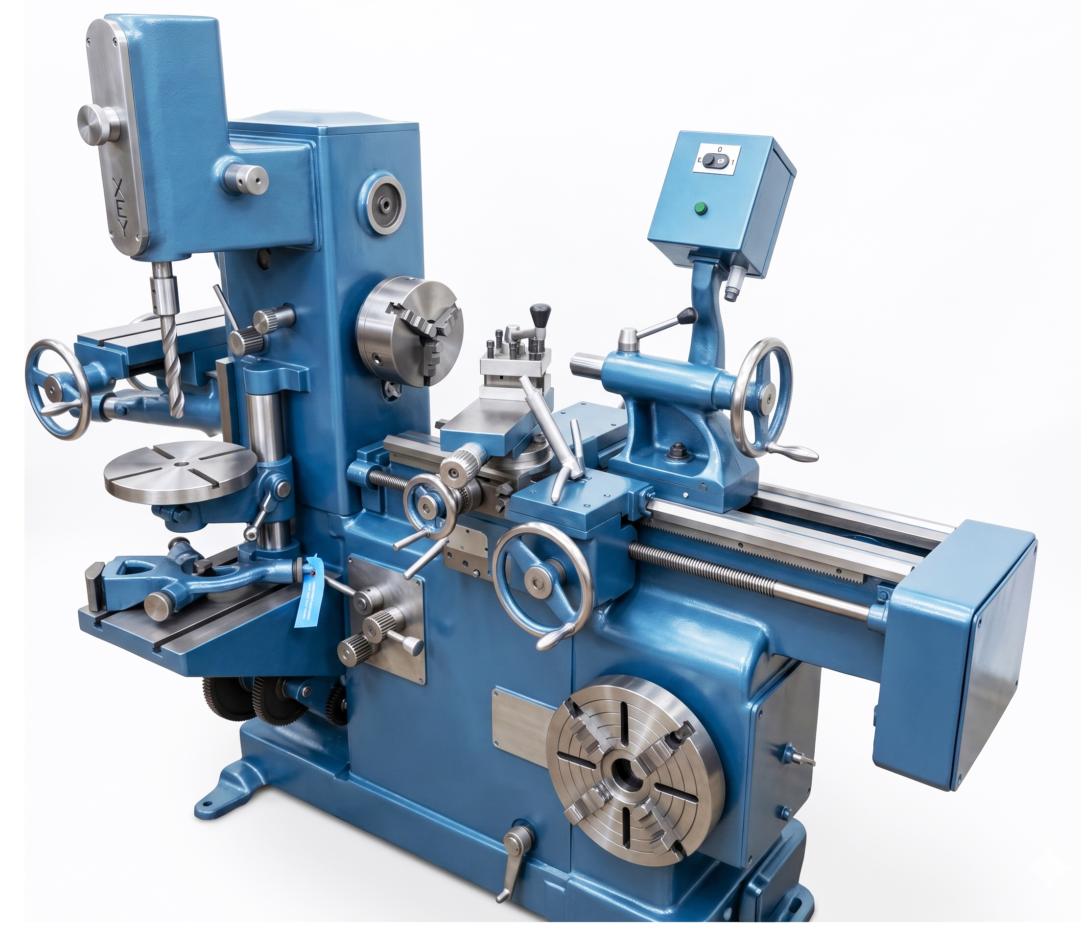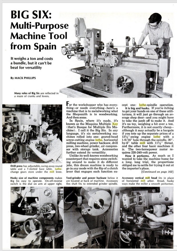 Manufactured by a company better known for woodworking machines and comprising six machine tools in one, the Maquina Multiple consisted of a backgeared and screwcutting lathe as the basic component, with the addition of a horizontal miller, a power hacksaw, a drill press, a double-ended grinder and, rather oddly, an air compressor. Although possibly a useful machine in a small workshop, or an a ship, the Maquina lacked the ultimate versatility of several other similar industrial-class types, for example the English Adcock & Shipley Universal which added a universal grinder; ; the Japanse Dainichi with a shaper; the French Siome Covema (S.I.O.M.E.), the German Leinweber and vintage-style Fuchs; the Austrian Krause and the Kitchen & Wade