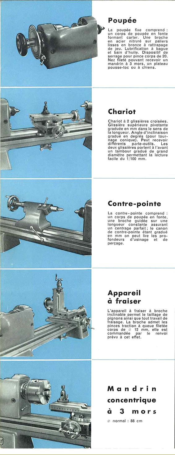 In addition to the ARE a number of other interesting, high-quality plain-turning, "bench precision" lathes are known to have been manufactured in France, these including: the unusual S2F Cordima, Crouzet, Jenny, Precis, the very early triangular-bed Prudor, S.O.M.B.V. and the "JCH" that came from the Roanne, a small town to the northwest of Lyon (it's likely that they made a plain version of their unusual Type TG2). Similar in proportions and capacity to later versions of the well-known Schaublin 102, the ARE was typical of a simple but beautifully-made class of lathe that was, at one time, an important part of both ordinary toolrooms and those shops that dealt with the manufacture, repair and maintenance of instruments, clocks, watches and other finely-made mechanical parts. Almost unknown outside its native France (though the makers claimed that over 3000 had been sold, a significant number for the type) the ARE was manufactured by Langlois & Jornod in Courbevoie (8 km from the centre of Paris), and met the standard laid down in the French "Jenny" system for machine-tool accuracy. Two versions were offered that differed only in their mounting arrangements: the TO.20.S for use on customer's own bench, with drive coming from a rear-mounted countershaft, and the TO.S.E, a type fitted to a beautifully constructed underdrive cabinet stand with a wooden top, built-in electrical controls, a storage cupboard for tools and a fitted collet drawer, coolant equipment and a round-belt drive "overhead" to power high-speed grinding and milling attachments carried in the toolpost or on a vertical slide. In order to run very small cutters and grinding wheels the "overhead" was capable of running at up to 7300 r.p.m. for external grinding and 12000 r.p.m. for internal. The stand was engineered so that an operator could sit down, though unlike some versions of the Swiss Simonet precision lathe, there was no leather-upholstered, swing out seat provided…. Like many other makes of precision bench lathes, the bed of the ARE had a flat top with bevelled edges, these acting to align the headstock, compound slide rest and tailstock. However, like the similar Schaublin and Agathon models, instead of relying solely upon the bevelled faces of the bed, the carriage was also aligned and supported against a "faux" apron that contacted the bed's vertical front face. A T-slot ran the full length of both front and back faces of the bed - a fitting handy for mounting a variety of accessories though, oddly, none of those illustrated in the maker's sales catalogue appeared to make use of this facility. Resembling the compound slide assembly as used on the Schaublin 102, that on the ARE had a 125 mm travel cross slide carrying a 115 mm travel, 360° swivel top slide with two longitudinal T-slots to provide a variety of alternative position for the toolpost and other fittings. Micrometer dials were unusually large, indeed, possibly the biggest ever fitted to the class of lathe A rugged structure, well braced across its front face, the headstock held a hardened, 16 mm -bore spindle running in large diameter plain bearings that was driven by a 3-step, flat-belt cone pulley. Power came from a 2-speed 750/1500 r.p.m. motor, the drive arrangements giving 12 speeds from 237 to 4600 r.p.m. Equipped with a No. 1 Morse taper spindle with a travel of 70 mm, the tailstock was a one-piece unit locked to the bed by a lever-operated cam. Usually, this class of lathe would have had a cut-out in the casting (engraved with a zero line) that revealed an engraved ruler scale - nor was the spindle fitted with a micrometer dial. Although the lack of both features was strange, at least the socket was a standard Morse taper and not some odd-ball invention of the maker.. Like most other European and American makers of similar high-class machines (of whom there were many including, amongst the better-known, Schaublin, Boley, Lorch, Mikron, Wolf,Jahn, Ames, Cataract, Pratt & Whitney, Stark and Hardinge) the ARE was offered with a range of accessories that allowed it to perform in the usual three distinct roles common to the type: toolmaker, second-operation and production capstan. However, none of these were shown in the accessories catalogue and they may have been special-order items. Instead, those listed confined its role to that of the first type with these including no fewer than three dividing attachment for the headstock, a hardened steel faceplate with tapped holes, high-speed grinding and milling heads for use in the toolpost, a hand T-rest, a screwcutting attachment that drove the top slide through a universally-jointed and splined carden shaft, a 4-way toolpost, alternative screw-driven slide rests and the usual milling slides, steadies and collets. A recent find was an ARE labelled as the Model TS-102S lathe, this being fitted with a heavy-duty lever-feed tailstock. The "S" might well be for "seconde oeuvre" this translating as "Second Operation" - one of the three arrangements possible with this type of lathe, these being "Toolmaker", "Second Operation" and "Production". Avez-vous un tour de ARE? Si c'est le cas, l'auteur serait heureux de vous entendre..