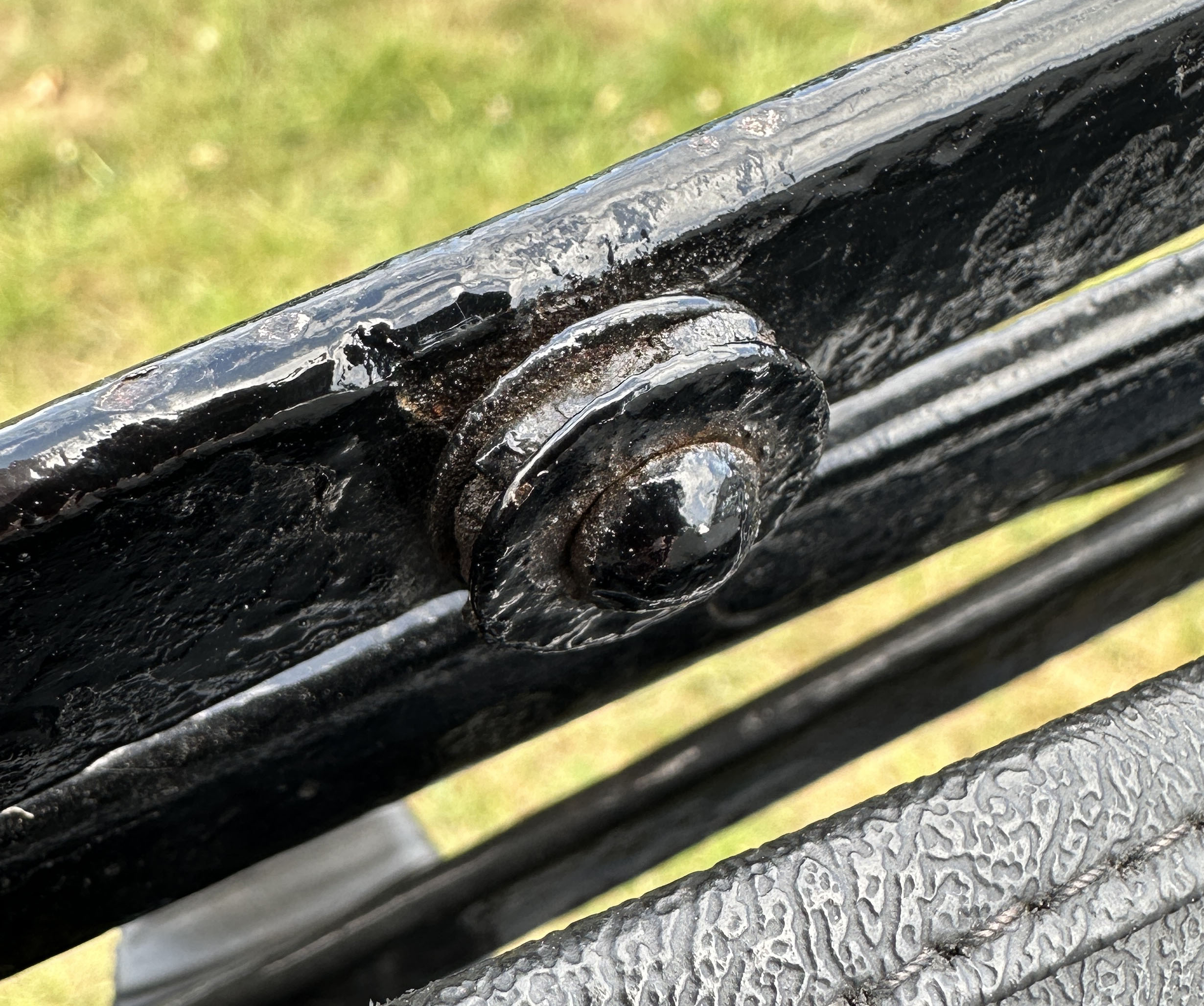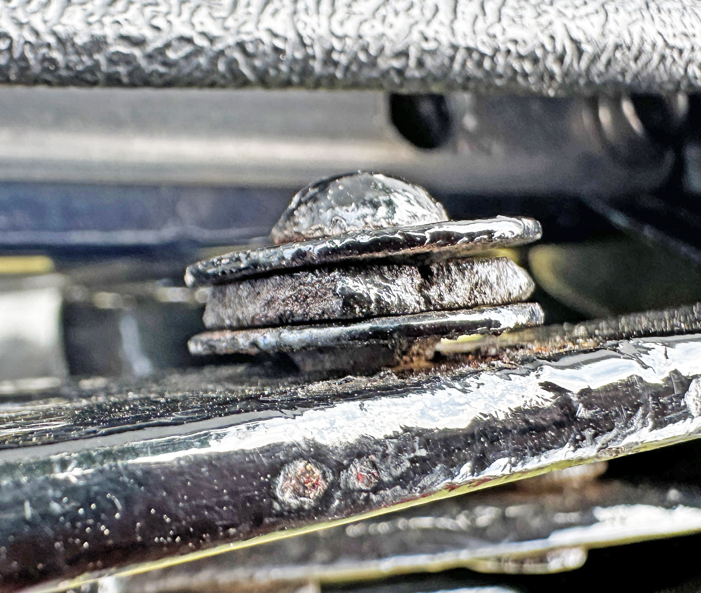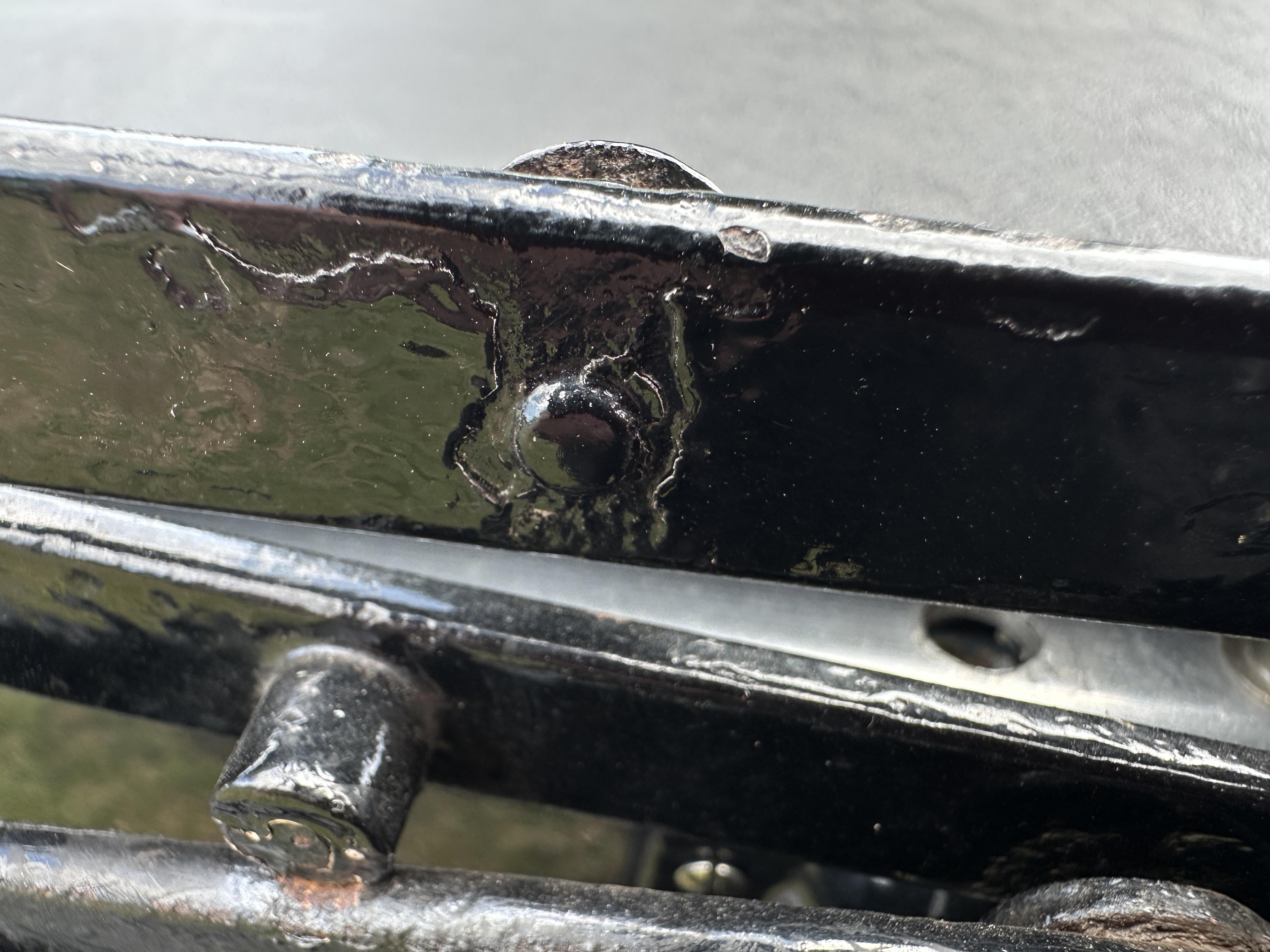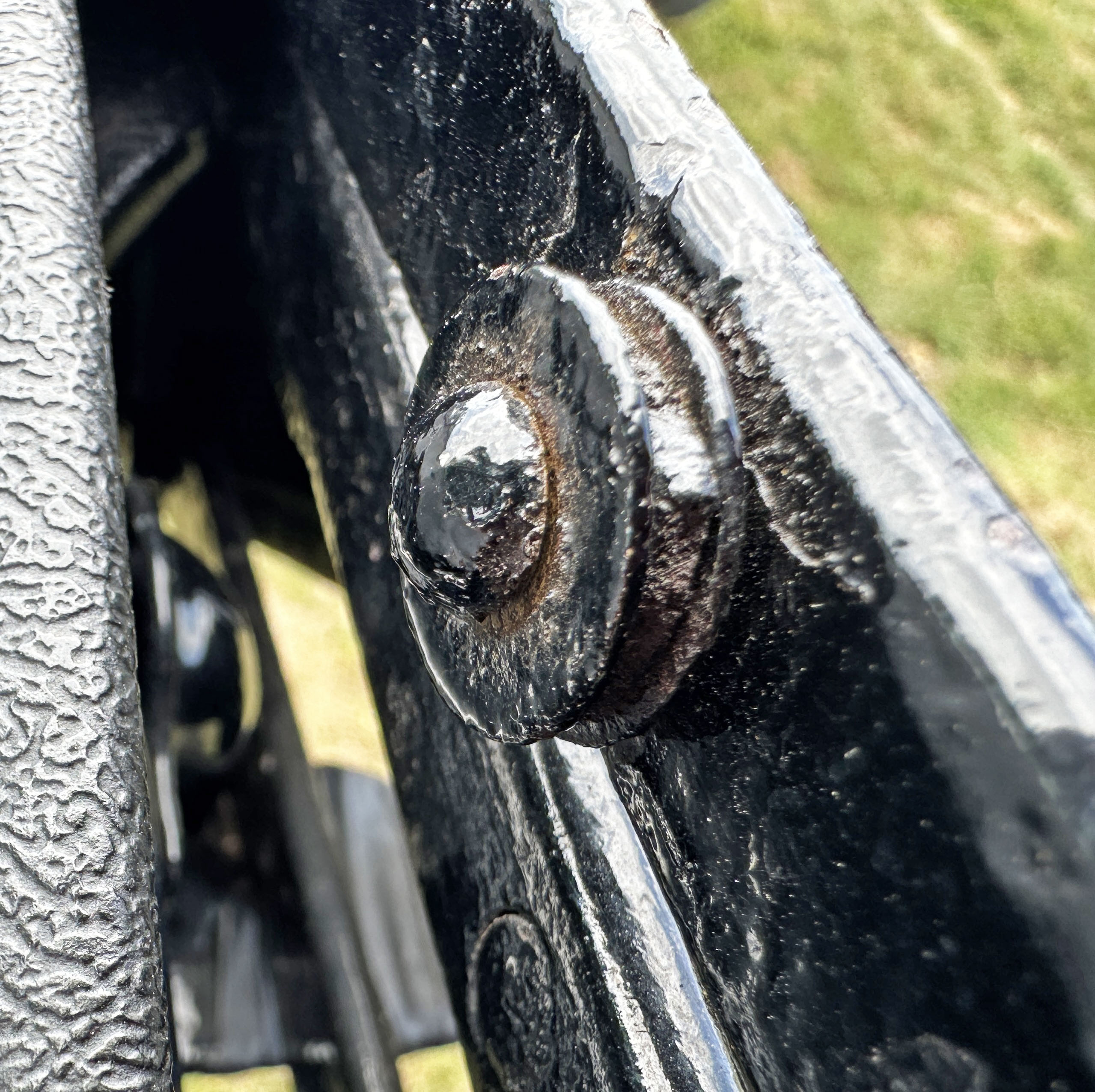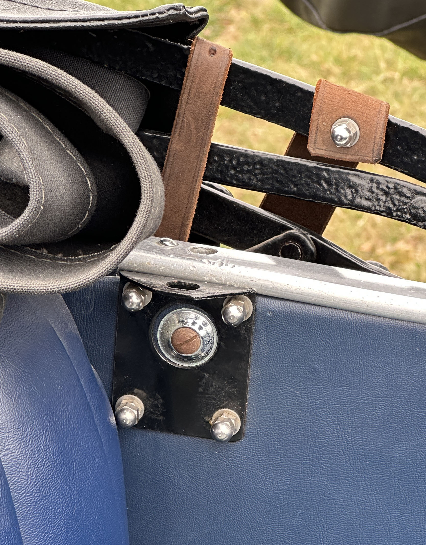 Above and below: the remains of an original rivet, its washers and leather used to hold the strap onto the hood's horizontal frame. If you have the hood frame off the car, reinstalling this as original is possible, but if on the car, most owners make do with a nut and bolt.