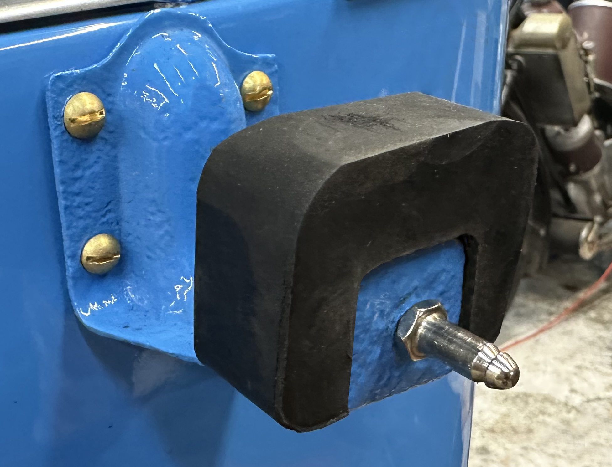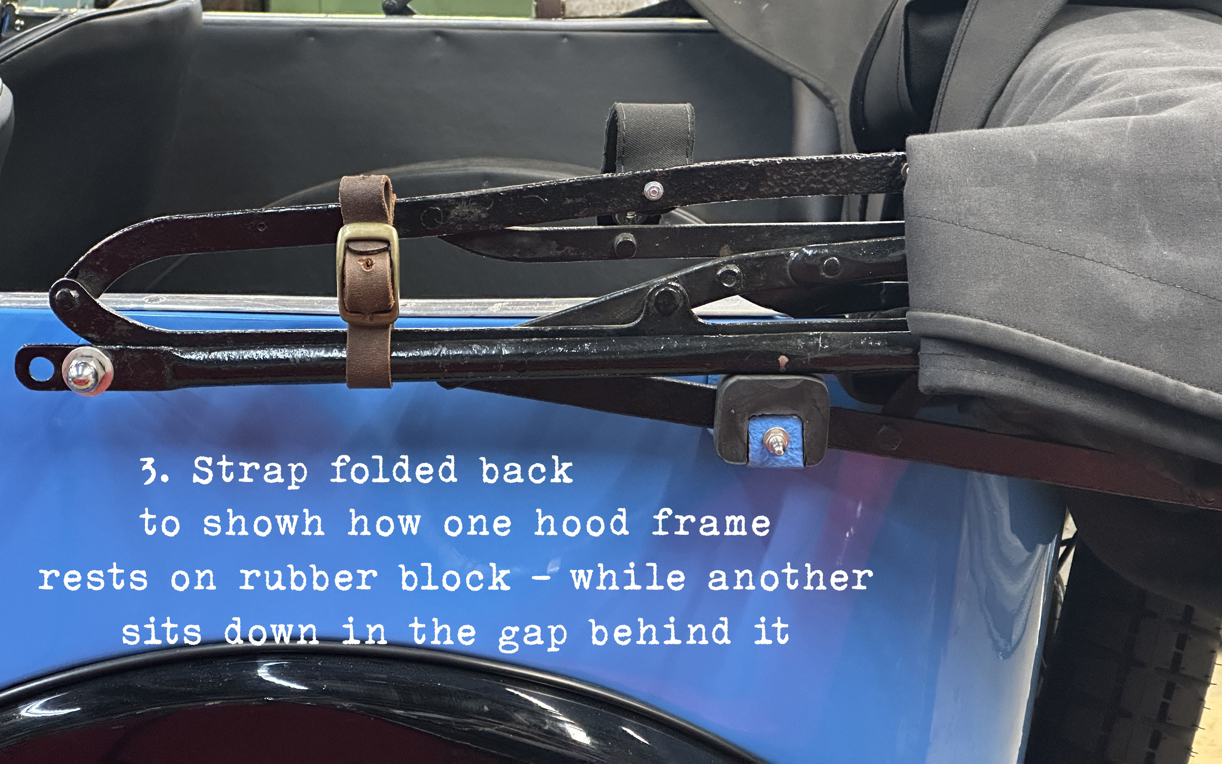 It's very common to see an Austin Sevens with its hood down, but with the frame sticks poking untidily into the air. On early cars where the hood frame rested on its pair of body supports, clips were fitted that held the frame together. Well, this was almost the case, as the clips were hard to operate, not particularly robust, and easily bent out of shape, becoming ineffective and so unused. A simple solution was to use a pair of dog collar straps around the frame, which did tidy things up. By September, 1929, Austin realised that a better solution was needed, and arranged for the now very much more substantial hood to have its frame rest on rubber blocks fitted to more robust support brackets Towards the front of each of the hood's two, flat-steel side frames was riveted a leather strap (shown below), the free end of which was equipped with a lift-the-dot fastener. With the hood down, the strap went over the hood irons and was clipped over the stud that protruded from the hood support bracket. By this means, the hood sticks were held together rather more firmly than before; even so, many owners still regarded this as inadequate and added the dog collar straps as well. The hood-rail-mounted leather straps are easy enough to source, and the rubber blocks can be made from the rubber bench blocks used by jewellers for working on small parts; to find them, Google "jewellers rubber bench blocks". If your car has a hood bag, it can also be secured at the front ears using the rubber blocks' lift-a-dot studs, though these will need to be the double-length type. The writer found that while making those for his car, the threaded section of the stud needed to be made much longer, a simple job that involved cutting off the original, tapping the hole 2BA and Loctiting in a suitable length of 2BA studding. You'll also have to make, drill and tap a small metal plate to fit against the back of the rubber block. More on sidescreens and their often fraught relationship to the hood can be found here and also here and here