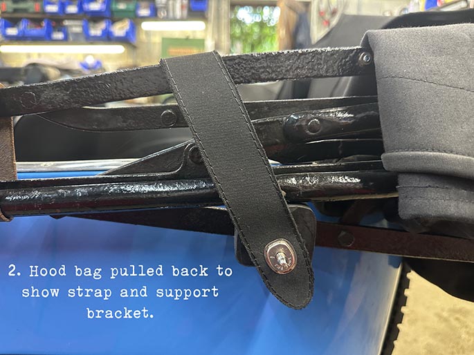 The hood-support bracket as used from September 1929 on the Tourers Types AE, AF and AG. The Lift-a-dot stud is a double-length type used to accommodate the fastening on the front ears of a hood bag.