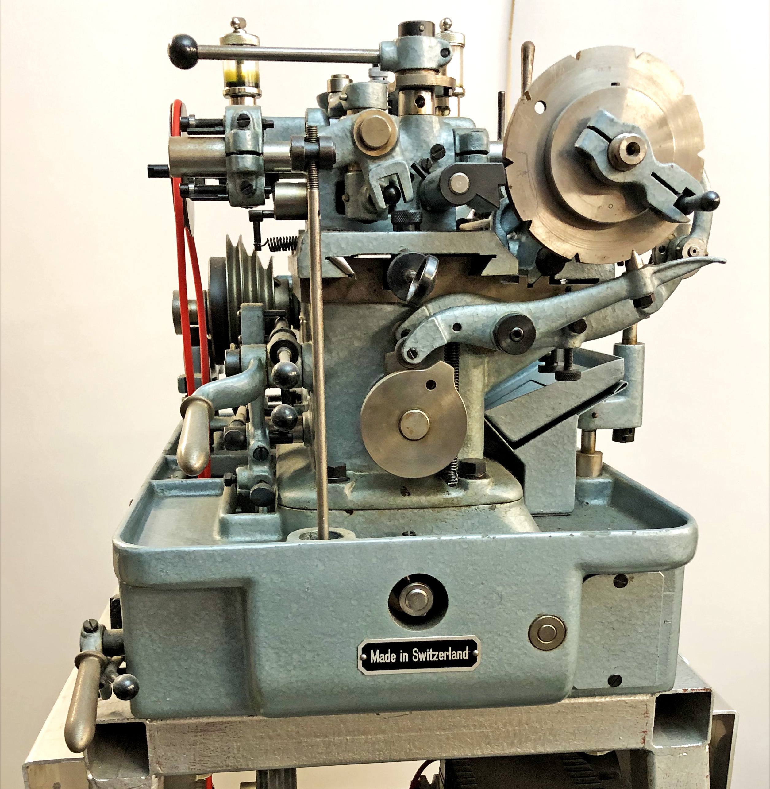 A pair of André Bechler Swiss "Simplex" Gear and Pinion Engines - unusual in that they were discovered unused decades after they were manufactured. One was then set up on a stand ready to use, the other preserved in as-found condition. The two machines appear to have been supplied originally to the Cosa Corporation of New York, a Company engaged in horological and mechanical instrument work and who once, it is believed, made a lathe for watchmakers - an example of which has yet to be found.