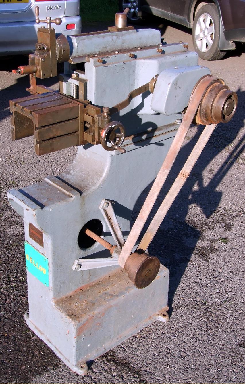 Carrying a plate showing that it was supplied by M. C. Layton Ltd. 96-98 Victoria Street. SW1. London, the Bellow shaper was unknown until one emerged from store in 2016. Of both unusual appearance and novel design, the shaper had its ram-drive reciprocating motion generated by a crankpin adjustable in a slot integral with the top surface of a large bevel-gear that, instead of being arranged vertically, was set horizontally. Construction was entirely traditional with iron usedfor all the castings, gear wheels and pulleys, mild steel for the shafts and feedscrews and with all threads of Whitworth form. Instead of the usual one-piece casting, the Bellow was constructed in two sections, upper and lower bolted together. The top element housed the bevel gear reduction drive with the ram on the top and a dovetail vertical slideway at the front carrying a horizontal slideway to which was attached a swivelling "work box" with T-slots its top as well as each side face. Oddly, the assembly was not a rigid box, but left open at the bottom - and also lacked any form of front support so limiting the machine to lighter cuts. The lower assembly was used to house the 1/2 h.p. 1400 r.p.m.motor and countershaft drive assembly that gave three speeds using two flat belts - final drive to the ram mechanism being by a lower pulley held on a Heath Robinson arrangement of a 3-leg support bracket spaced well out from the main body of the machine. The stroke was adjustable between 2 ½" - 6 ½" with a slow rate of 40 strokes/minute, a medium of 60 and a fast of 80. The swivelling tool slide had a travel of 2 ½". Fitted with power feed by the usual ratchet mechanism found on nearly all shapers, the table could be moved horizontally through a travel of 8" and raised through 4" by a handwheel positioned rather inaccessibly beneath the casting. Overall dimensions were: length 28" (700 mm); width 22" (560 mm) and height 47" (1200 mm) with a weight of approximately 3 cwt (150 kg)..