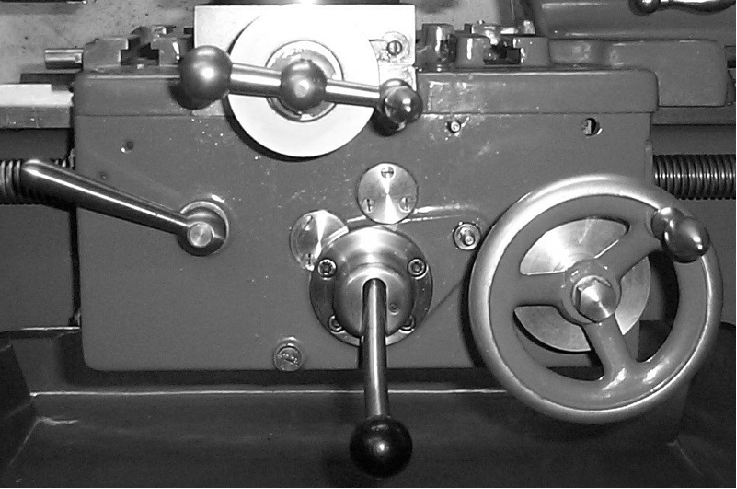 Some versions of the lathe were fitted with a spindle-direction control shaft below and parallel to the leadscrew with an operating handle (A) fastened to the right-hand face of the apron.
