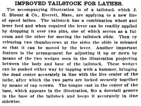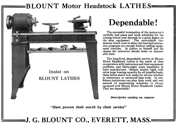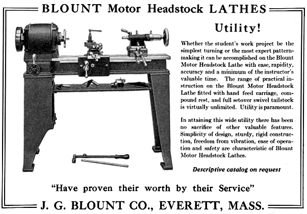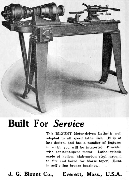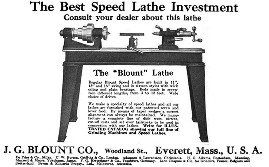 Founded in 1891 by John G. Blount (1985-1943) and his brother, Eugene I. Blount (1854-1932), the initial products were buffing and grinding machines, with lathe production following in 1920. The Company's lathes were simple, plain-turning models, listed at the time as "speed lathes", "Pattern makers'" and intended for hand-turning wood, brass, and other soft metals. In a 1909 catalogue, the brand names used by the Company were "Speed" and "Stuyvesant" and lathes were listed with swings of 11, 13 and 16 inches and bed lengths from 3 to 12 feet. As simple, easy-to-uses machines, many were sold to schools and training establishments. On the original models, the Morse-taper headstock spindle ran in two-bolt-retained bronze bearings and was fitted with a 4-step cone pulley for drive by a flat belt. Presumably, as the lathes would have appealed to smaller workshops without overhead line shafting, Blount must also have offered wall and ceiling-mounted countershafts At first, only a T-rest was provided, but in 1903, a set-over tailstock became available, and by 1910, one could also order a screw-feed slide-rest assembly, a bed-mounted capstan unit for light production work. One later model could be had with what appears to have been a variable-speed electric motor mounted behind the headstock, with drive direct to the spindle. Another version used the motor itself as the headstock, this being termed by the makers as the "Motor Headstock" model and also fitted, if the type of electrical control gear fitted is any guide, with stepped variable speed drive A noted improvement was a tailstock that offered to ability to adjusted, with wedges, to align perfectly with the head and also had an unusual combined lever and screw feed to the spindle. With agents appointed in England, the Netherlands, Japan, Germany, France, Belgium, Switzerland and Australia, the Company must have enjoyed some considerable success and, indeed, production of grinders and buffers, and probably other products, continued until 1964 when they were bought out by Williams & Hussey Machine Co., Inc. The website Vintagemachinery.org reports: "We have seen a lathe labelled, "Manufactured by J. G. Blount Co. / A division of Williams & Hussey Machine Corp. / Milford, New Hampshire 03055".