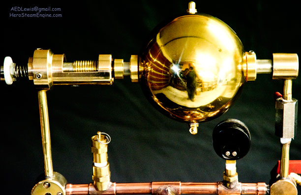 This beautiful reproduction of Hero's engine following the appearance of these machines in the ancient or medieval literature was built by expert model maker John Bentley. He may be the only other person who has reported the steam pressure, jet size and RPM achieved by a Hero's engine. |