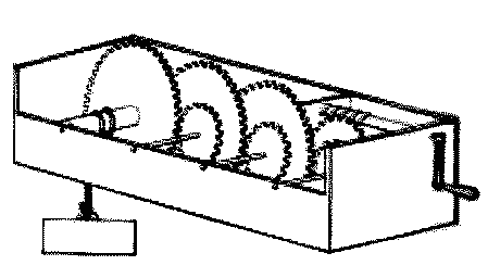 Another sketch of Hero's odometer showing four worm gears in series (From Lahanas (n). |