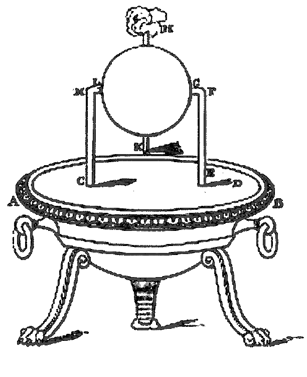 This etching of Hero's steam engine is not from his original manuscript which has been lost. It was probably produced in the middle ages. It shows steam forced out of the jets causing the sphere to rotate. It is heated by a fire. Letters on the diagram match those in Hero's written description. |