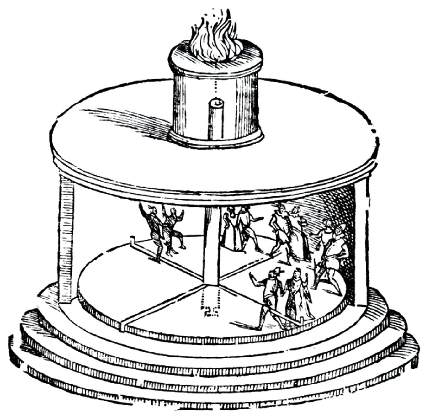 A woodcut etching of Hero's dancing figures. This works on the same principal as Hero's steam engine but uses heated air (instead of steam) escaping from jets at the edges of the dance floor to make it rotate. The jets appear to be drawn at the wrong angles.They should be in the same plane as the dance floor at a tangent to the floor. (From Wikipedia.) |