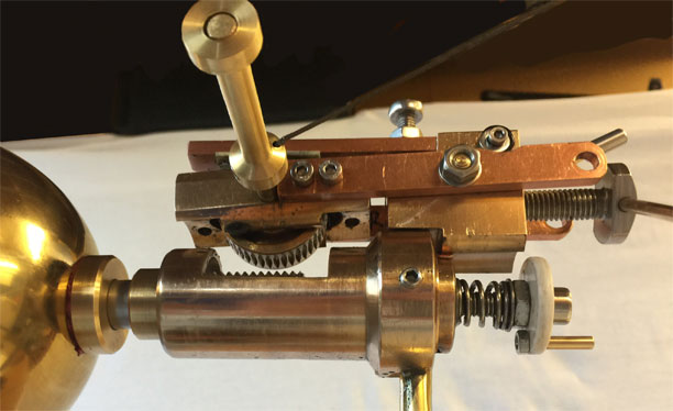 My design includes a pressure gauge that shows 0-15 psi and a pressure relief valve which opens to release steam if the pressure goes over 15 psi. In this version I made a single 'stop-cock' valve that could direct the steam up to the rotor, out to an exhaust vent, or close it off completely. Unfortunately it bucked when heated for soldering and was replaced with two commercially available valves, one for the exhast vent and one to open the pipe to the spinning rotor.