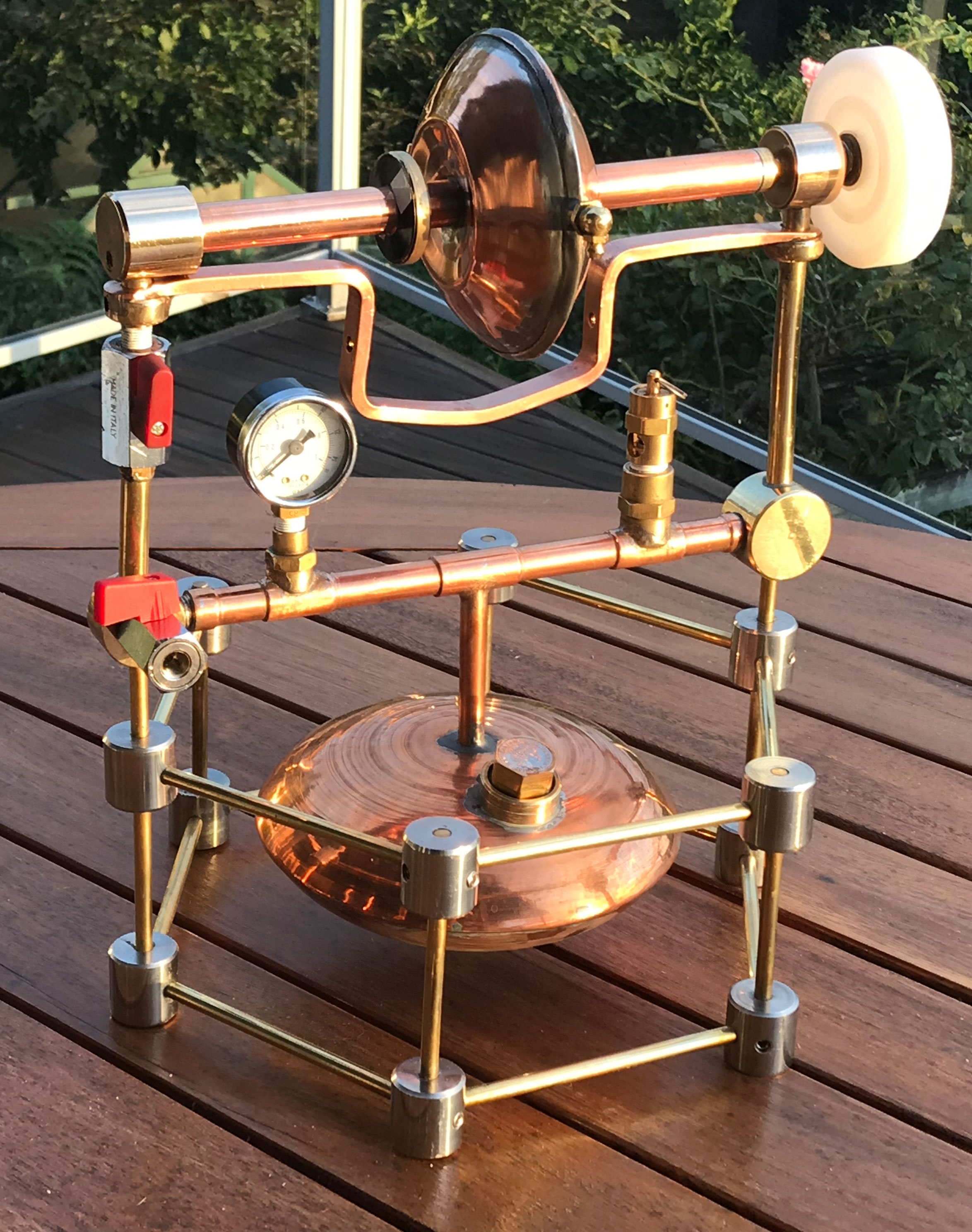 I became interested in Hero’s steam engine when I inherited a model of the ‘aeolipile’ from my Grandfather, Hugh Sargeant Barrett, who was a stationary steam engine engineer. He made this model by using a large copper kettle as a boiler (3.5 liters) to produce steam which was conducted up vertical pipes. These pipes supported a copper sphere (which had been the float in a toilet cistern) supported between two pointed pivots. I saw this operating as a child but now it was badly dented and the base had blown out of the kettle when it had been allowed to run dry.