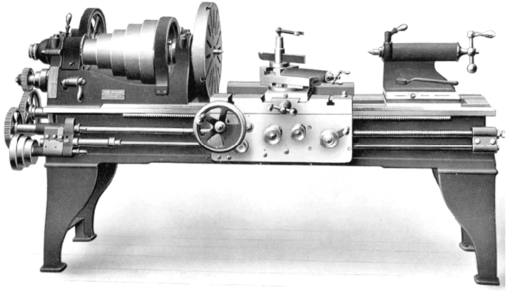 25-inch Bradford. This was very much more heavily constructed machine than the 21 inch and had a substantially deeper and heavier bed (mounted on two massive cast-iron box-section cabinets) that weighed 25% more per foot of length than the smaller lathe. The No. 4 Morse taper tailstock was fitted with a rack drive and two clamping plates. This particular example is fitted with the Friction Backgear assembly, which not only allowed instantaneous changes to be made between the low and high speed ranges, but provided a neutral position in the middle which stopped the spindle rotating. This accessory was available on all Bradford lathes up to and including the 25-inch.