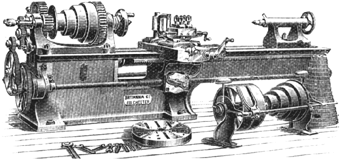 Britannia 4-inch, 4.5-inch and 5-inch centre height backgeared, gap-bed, screwcutting No. 15 lathe on a single-flywheel treadle stand and fitted with a (5-speed) light-duty rope drive. Because the leadscrew feed also provided, when driven by the correct arrangement of changewheels, a slow-acting feed to the carriage, lathes of this type were advertised for many years as "self-acting". A conventional, directly-geared rack feed was fitted to the carriage which, like that on the No. 14, was not designed to allow the tool to be moved under hand guidance, but simple to reposition it quickly after a long cut. The bed was 6.125 inches wide, and 4.5 inches deep, and available in two lengths of 4 and 5 feet - which gave 30 and 42 inches between centres respectively. The gap allowed a maximum diameter of 16 inches to be swung - which might have been hard work considering the limited power available from the relatively light, single flywheel and primitive gut-drive belt - though for 21 shilling extra, a set of flat pulleys was offered which would have improved matters considerably. 22 changewheels of 1/4" pitch and with an as-cast finish were supplied for screwcutting; fully machined gear wheels were extra throughout the range but the engagement clasp nuts were of gun metal and properly arranged in a top and bottom pair. An interesting option - for £4 extra - was the provision of power sliding (a feed along the bed) and surfacing (across the ways) by a separate "backshaft" which ran down the back of the bed. How the drive to this was arranged is not entirely clear - it is known that a worm wheel was used but no pictures appear in any of the sales literature; however, a set of connecting gears driving across the width of the bed, from either the headstock or tailstock end of the leadscrew, was the normal way of arranging this once common feature. The compound slide rest had, like many competing makes, no micrometer collars on the feed screws - although the swivelling top slide did carry degree markings for setting the angle correctly. In 1899 the price for a 4 foot backgeared and screwcutting 4-inch model on the treadle stand was £25 : 4s : 0d. , for the 4.5-inch centre height version £26 : 15s : 0d and for the largest, 5-inch model, £28 : 7s : 0d. The 5 foot bed was an extra £2.