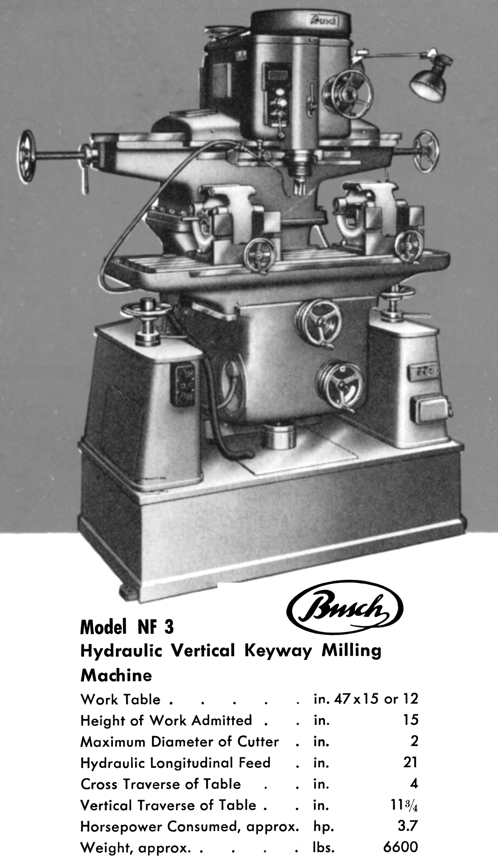 Manufactured by A.u.W.Busch KG Maschinenfabrick of 582 Gevelsberg, I. Westf. in Germany, Busch milling machines were of a special, if not to say unusual design. A range of models was offered, some intended for ordinary milling work, others of special construction advertised as "Vertical Keyway Milling Machines" and ones intended for work that involved machining "Square, Rectangular and Rhomboid Contours".