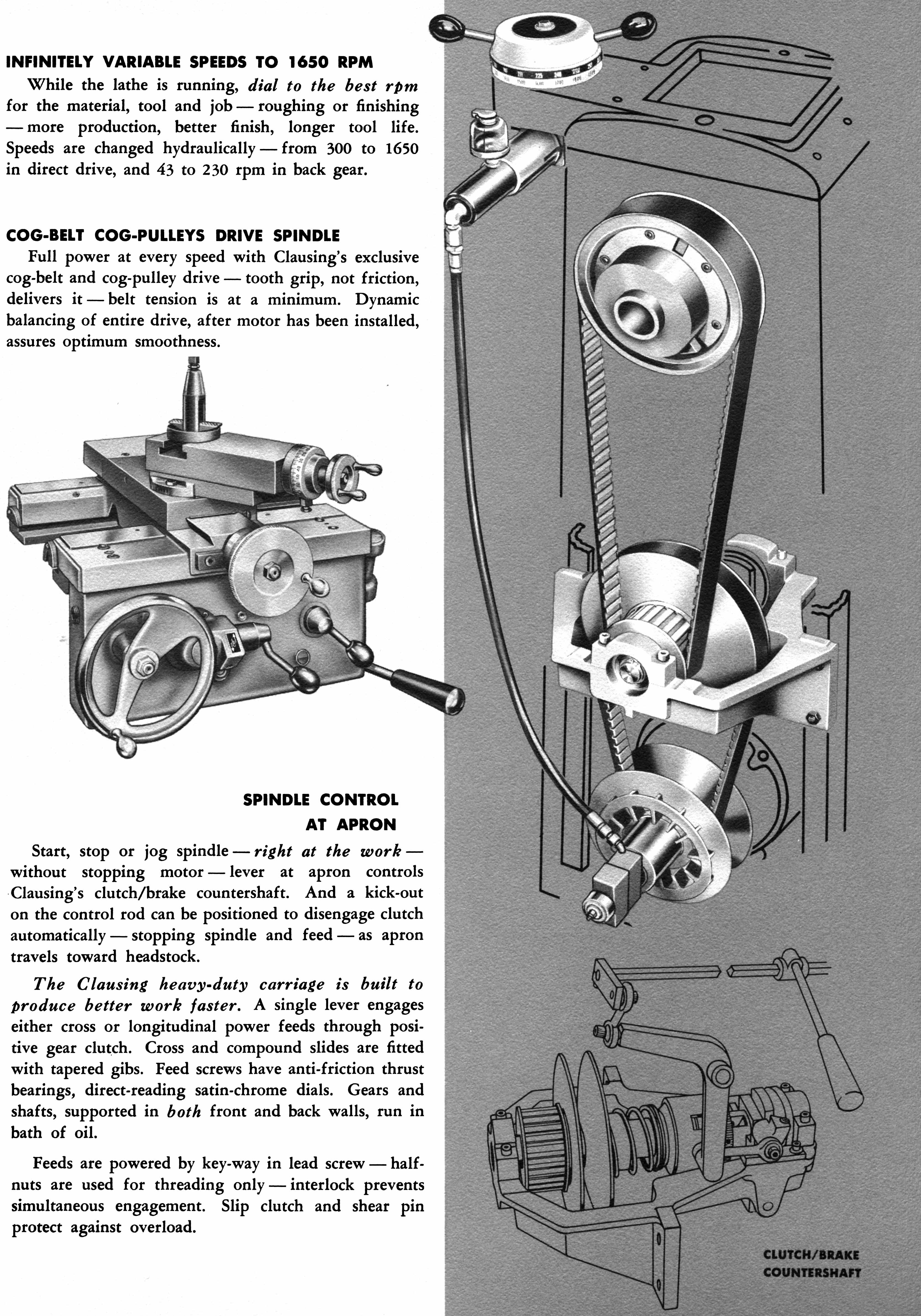 By the late 1960s Clausing lathes had become rather squarer in appearance, a styling and design change clearly seen in the 1968 Clausing 6900 Series machine illustrated and described below. The machine was based on a robust, flame-hardened, ground-finished bed that was well braced between elliptically shaped, rearward-draining, swarf-clearance holes. Made in a forged, chrome-steel the headstock spindle had a hardened nose, was bored 13/8", and ran on precision Timken taper-roller bearings. Two types of collet fitting were available, a simple spring-collet assembly (which used either a hand-operated or lever-type draw tube) or the beautifully-well engineered English Burnerd Multisize collet set that ranged in capacity from 1/16" to 1". Each Multsize collet spanned a 1/8" gripping range and so could be used for both English and metric-sized material. A more highly developed screwcutting and feeds gearbox was fitted to the 14-inch swing version of these lathes; while the 10-inch and 12-inch had an open base, the 14-inch enjoyed a sealed assembly with oil bath lubrication and dial and lever controls. A knob protruding from the headstock-end guard was used to select either fine feeds or screwcutting ratios. The drive system on the 6900 Series - the largest of the new Clausing range - was of the variable-speed type that gave from 52 to 2000 r.p.m. - with 26 to 280 r.p.m. in backgear and 180 to 2000 r.p.m. in direct belt drive. Speed changes were made hydraulically by a conveniently-positioned dial of the top of the headstock - a lovely idea for operator convenience and the speeding up of jobs, but just one more thing to go wrong in the future. A further model was also offered, the "High/Low", but this was just fitted with a 2-speed motor to give an improved selection of speed comprising two low ranges in backgear (on the slow motor speed) from 21 to 115 r.p.m. and 43 to 230 r.p.m. and two high ranges in direct drive (on the high motor speed) of 150 to 825 r.p.m. and 300 to 1650 r.p.m..