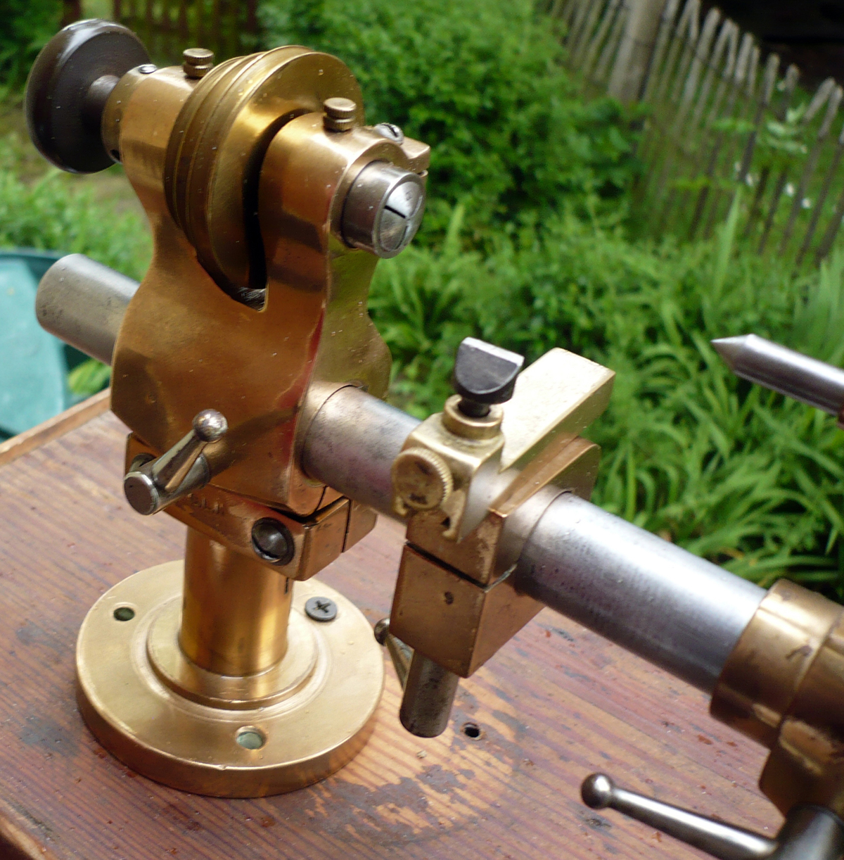 As found the lathe was held in a nicely-made, fitted wooden box complete with a screw-feed compound slide-rest assembly - the top slide being in steel. Although the cross slide lacked a micrometer dial, the swivelling top slide was so fitted, though it was far from satisfactory having lines engraved at well-spaced intervals and with hand-stamped digits. However, it could be zeroed and the locking mechanism was of the "face type" that prevented the setting from being upset at it was tightened. The tailstock had a substantial spindle that could well have been locked by a proper split-barrel arrangement. that could well be original.