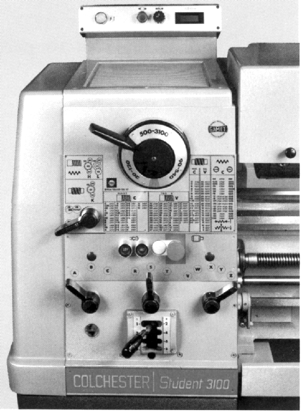 Constructed in the style of the already established and very successful 7.5-inch centre height Triumph 2000 and 8.5-inch Mascot 1600 models, the 6.5-inch (165 mm) centre height Student 3100 (together with its close cousins the Student 1800 and Master 2500), continued Colchester's traditional use of two names that had been synonymous with lathes of an almost perfect design and capacity for both training and professional workshop use since the early 1950s. As with older Student and Master model the two lathes shared the vast majority of their components and had only small but nevertheless significant differences in their specifications - all of which, in the case of the newer machines, centred on the headstock and drive system. The expensive Student 3100 was intended to fill the niche vacated by the long-serving 3000 rpm variable-speed "Chipmaster", a machine that proved so popular its production was continued until 1983. Unfortunately, the appeal of the tough little Chipmaster had always been restricted by its limited capacity: a centre height of 5.5 inches and a capacity between centres of just 20 inches made it suitable only for the smaller tasks in a commercial workshop. The "3100" was designed to overcome these limitations and was not only much larger but fitted with an improved and more reliable variable-speed drive system that employed three "geared" speed ranges; these ranges allowed seamless bands of speeds to be selected between 20 to 120 rpm, 90 to 540 r.p.m. and 500 to 3100 r.p.m. and also ensured that a great amount of torque was available at the slower revolutions. Claimed by the makers to be "maintenance-free" a pair of expanding and contracting pulleys generated the variable-speed changes while a simple gear set within the headstock delivered the fixed speed ranges. The speeds were caused to change by push buttons that activated (limit-switch protected) motors driving threaded rods that caused the pulleys to be moved closer together or further apart - with the "geared ranges" engaged by a single handle integral with a large dial on the face of the headstock. A digital speed display was fitted to the headstock. Because of the high top speed, and the lathe's ability to mount very large jobs, the makers warned against the use of other than the dynamically balanced, ductile-iron chucks with hardened scrolls that had been specially commissioned from Burnerd; if a new chuck is required on these lathes it would be unwise to fit anything other than one recommended by a reputable Western manufacturer. You are welcome to email for details of quality replacements that we can recommend. Once the motor had been switched on by a headstock-mounted push-button starter the starting and stopping of the spindle was by a single lever pivoted from the right-hand apron wall and working through a 'third shaft' (parallel and below the feed shaft and leadscrew) and connected by links to a cross shaft that passed through the bed just in front of the headstock. Although the lathe was capable of rotating heavy jobs at high speed it was not possible, because of the variable-speed drive system, to fit the same sort of powerful spindle brake that was used on the otherwise very similar Student 1800 and Master 2500 Models. The lathe was, however, fitted with an automatic "fail safe" brake that had a manual release button. Also included was a headstock-mounted emergency-stop button that operated through the obligatory "no-volt" release (to prevent the motor restarting after a power cut) and a motor-run warning light to alert the hard-of-hearing, or those working in a noisy environment, that things were "active" and the controls should not be played with casually. The rest of the machine was identical to the ordinary Student 1800 and all the accessories for that lathe, and the Master 2500, were identical. 9.5-inch (230mm) wide, the bed was induction hardened and ground-finished as standard; it was of the usual Colchester V-and-flat type with separate pairs of ways for the carriage and tailstock. It was available in two lengths that gave either 25 or 40 inches (635 mm and 1000 mm) between centres but wisely could not, because of its size and very high top speed, be ordered with a gap. The headstock gears were lubricated by oil splash, from a supply within the base, with the system improved by the fitting of a "distributor tray" in the roof of the headstock that collected the flung up oil and fed it though pipes to ensure that it reached the right places; the same oil was fed, unfiltered, to the "Gamet Super Precision", pre-loaded and self-adjusting taper roller bearings. The 1.625" (40 mm) bore, 4-in D1 Cam Lock nose spindle was especially rigid and had been designed in conjunction with the British Machine Tool Industry Research Association. Continued below: