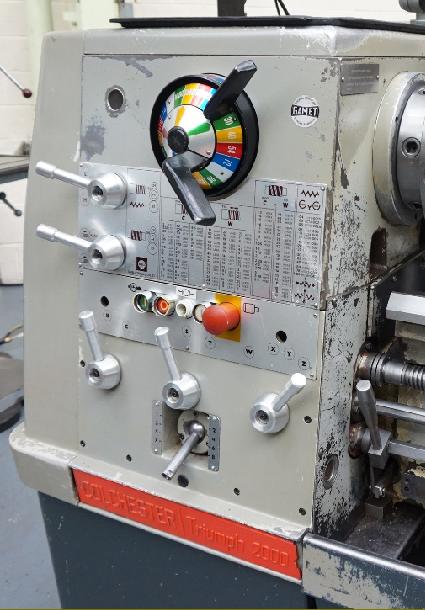 Built during February 1968, at the Company's long-established Essex works, the first production Triumph 2000 was the second Model in a new range of lathes introduced by Colchester during the latter half of the decade. Like the first in the Series, the Mascot 1600 (produced from November, 1965), it was a revolution in styling and specification and (though the new models may have lacked mechanical novelty) were a strong reminder that even machine tools are subject to the vagaries and whims of fashion for, with their distinctive 'square' styling, ergonomically-designed controls and bright finishes, the new lathes made their competitors look distinctly dowdy and old-fashioned. It would be unfair, however, to dismiss the Triumph 2000 as a mere styling exercise for this important and very popular lathe was a tough, well-made machine with a combination of capacity, speed and ease of use that made it ideal as a both general-purpose lathe for industry and, because of its modest price, also affordable by smaller machine shops who needed an all-round workhorse able to handle as great a variety of tasks as possible. So successful was the model that, for some time after its introduction, demand outstripped supply by a considerable margin and used examples were so difficult to find that good ones fetched almost list price. 11 inches (280 mm) wide the bed was induction hardened and ground-finished as standard; it was of the usual Colchester V-and-flat type, with separate pairs of ways for the carriage and tailstock, and available in two lengths that gave either 30 or 50 inches (760 mm and 1270 mm) between centres. Both beds could be had either with or without a detachable gap piece that allowed material up to 23-inches (580 mm) in diameter and 6.125 inches (155 mm) thick to be swung on the (optional-extra) 14 and 21-inch (355 mm or 535 mm) diameter faceplates. Power was provided by a 5.6 kW (7.5 hp) base-mounted motor that drove through 4 V belts to instant-acting forward-and-reverse "wet" multi-plate clutches of Matrix manufacture mounted inside the headstock on the rearmost layshaft. However, due to a shortage of Matrix components, from Serial No. 28412 German Ortlinghaus clutches were used as well. The headstock casting could be adjusted laterally on the bed, although before altering the factory setting the owner was strongly cautioned to consult the (very comprehensive) owner's manual. The lubrication arrangements for the headstock reflected the harder work that the lathe was intended to perform and used an impeller-type pump mounted on a oil tank fitted inside the headstock-end plinth and driven from a fifth groove on the main drive pulley; from the tank the oil was taken to a "distributor block" fastened beneath the headstock's top cover and from there by pipes to the required locations. A flow-indicator sight-glass was fitted to the front face of the headstock to allow the operator to check that oil was flowing correctly. With a hardened 6-in D1 Camlock nose the 2.1875" (55.5 mm) bore spindle was especially rigid and had been designed in conjunction with the British Machine Tool Industry Research Association. All the gears in the headstock, and not just those responsible for the main drive as on less heavily stressed Colchester models, were hardened and finish ground on Reishauer machines. 16 speeds were available, from 25 to 2000 rpm and, because of the high top speed and the capacity of the lathe, the makers warned against the use of other than the dynamically balanced, ductile-iron chucks with hardened scrolls that had been specially commissioned from Burnerd; if a new chuck is required on these lathes it would be unwise to fit anything other than one recommended by a reputable Western manufacturer. You are welcome to email for advice as to what is suitable. Concentrically mounted paddle levers on the front face of the headstock selected the spindle speeds and worked through an ingenious and compact mechanism, with (for a machine tool) an almost foolproof system of colour coding to indicate the settings. Once the motor had been switched on by the headstock-mounted push-button starter the spindle control was by two levers: one pivoted from the right-hand apron wall and the other up against the inner face of the gearbox; both worked through a 'third shaft' (parallel and below the feed shaft and leadscrew) that was connected by links to a cross-shaft that passed through the bed just in front of the headstock. The apron lever gave a stop, forward and reverse action the other just a reverse and stop; in conjunction with the headstock-mounted clutches and electrical switches (and a foot-operated brake) this easily-operated and safe system allowed the operator to control the spindle from either the vicinity of the toolpost or the headstock - and all while the motor was left running so that the minimum of time was wasted waiting for speed to build up (it took 4 to 5 seconds to reach 2000 rpm with a 12-inch chuck fitted) - or slow down. At Serial No. 28412 the mechanical foot-brake was replaced by a Simplatroll spring-engaged, electrically-released unit; moving the clutch control lever into forward or reverse energised the brake solenoid, causing it to release; at the same time the power indicator lamp of the earlier models was replaced by a push button that also energised the solenoid, so allowing the chuck to be rotated by hand (though on some models this facility may be blocked if a high speed is selected). At serial No. 22096, the knurled edges of the micrometer dials appear to have been changed to a pattern similar in appearance to "truncated chainwheels" (probably for better grip) and, simultaneously, a micrometer dial was fitted as standard to the carriage handwheel - a useful item that had always been on the options' list. At around the same time - or possibly not until Serial No. 28501 - dual metric/imperial dials became available for the top and cross slides and at Serial No. 36035 the auxil