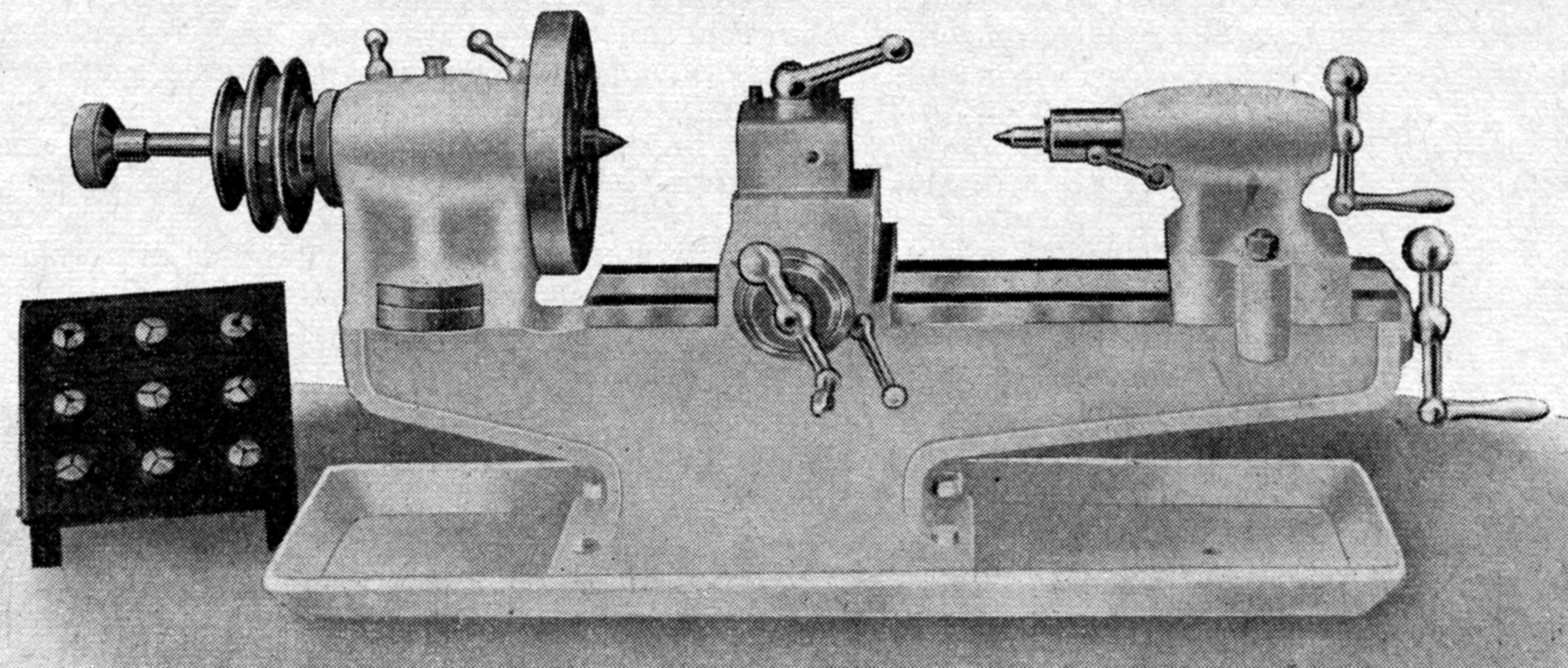 Although to become famous for their high-quality wood-turning lathes and associated equipment, the Coronet Company began life as a maker of machine tools in a rather different field. At the Model Engineering Exhibition of 1946 they displayed not wood-working equipment but four new small precision lathes, three of which were plain-turning types and one backgeared and screwcutting. The plain lathes were the "Diamond" (with a flat-topped bed) and a pair with round, solid steel bar beds; the "Jewel", "Ruby". The screwcutting lathe was the 3" x 12" "Tiara" of which, unfortunately, no surviving example have been found nor any supporting paperwork. Of rather conventional appearance, with a flat-topped, cantilever-form bed, the 2.25" x 6" "Diamond" had a headstock assembly that could be unbolted from the bed and a base that allowed it to be swivelled 10° in either direction from central. The spindle (plain-bearing and ball-race) was, apart from a 11/16" x 20 t.p.i. nose thread and a No. 1 Morse taper, identical to that used on the other lathes and could be exchanged for the high-speed version. A hand-operated feed was provided for the carriage, the overhung leadscrew (complete with a zeroing micrometer dial) passing, rather unusually, down the rear of the bed. Unfortunately, only a single swivel slide was provided (though with a very large and easy-to-read micrometer dial) carried on a post that fitted into a hole formed in the front of the saddle - the design allowing it to be adjusted vertically over a small range. While this arrangement provided a quick and easy way of adjusting the tool height (just like the fitting on a Round Bed Drummond) it did nothing for rigidity, the cutting tool being cantilevered well away from its mounting. Of the ordinary screw-feed type, the tailstock could be set over for the turning of slight tapers and was fitted with a proper compression-type barrel lock. It appears that the Diamond might have been intended for production in some numbers, the micrometer dials on tool-slide and leadscrew being pressure die-cast in Zamak, just like the ones fitted to the contemporary Myford ML7. Described by the makers as The Watch and Clockmakers Lathe and Multi Propose Machine, the tiny, 1.5" centre height Ruby used a headstock casting that doubled as a mounting foot with a bolt-on motor as part of the optional equipment. However, as the latter carried just a 2-step pulley (when a 4-step could have been specified for only a few pence extra), the speed range was severely limited. The headstock pulley was overhung, an unusual and rather brave design decision for a precision lathe where the tradition of super-accurate bearings, of hardened steel, honed and lapped to perfection, with the pulley carried between them, had been established for over 80 years. By coincidence, the same decision had been reached by the English Pultra Company on their new range of 17/50 and 17/70 models, also announced in 1946/7. In the event, Coronet found themselves up against a number of competitors including not only continental makers such as Schaublin, but also Boxford who were manufacturing two miniature precision lathes, one a beautiful 3.3" x 9.25" plain-turning bench type and the other a dedicated capstan. Intended to function either as a lathe or a precision drilling and milling machine, the Ruby was mounted on a heavy cast-iron base plate formed with a post socket at one end. With the lathe set as a drill, the bed was up-ended, dropped into the socket and held in place by a long through-bolt. The tailstock, already provided with a lever-action feed (by the simple expedient of peg passing through a slot cut through the top of the casting) was fitted with a collet-retained faceplate that acted as a drilling table - while the (optional-extra) compound-slide rest assembly could be pressed into service as a co-ordinate table for vertical milling. In order to provide the greatest versatility, the headstock was available with a choice of two cartridge spindles: one for ordinary work with an adjustable tapered bronze bush at the front and a single ball race at the back (an arrangement also used, in a non-cartridge form, on most of the Company's wood lathes) and the other, a high-speed unit, with ball races at both ends. The assembly (not unlike that used on the first Emco Unimat lathes from 1953 and resembling a bicycle hub) was clamped into the headstock by a single lever closing down a slot in the casting; hence it could be removed very easily and swapped over. With a 0.314" bore and a 5/8" x 26 t.p.i. nose thread, the spindle was designed, like the tailstock, to accept draw-in 8 mm collets. Beautifully painted in black ripple enamel (crackle-black, a popular finish at the time and used to denote a quality product ) and with all the locking rings and adjusters beautifully knurled, the basic Ruby retailed for £18 : 18s : 6d without a motor (for comparison a backgeared and screwcutting ML7 was first listed at £36). Complete and ready to run the price rose to £24 : 18s : 0d. A compound slide was an extra £9 : 18s : 6d, a 2.5" precision 3-jaw chuck £6 : 15 : 0d, wire collets 7s : 6d each and stepped collets 12s : 0d. Supplied as standard with each machine was the cast-iron base plate, a hand T-rest, faceplate, driving pin, collet draw-in tubes for headstock and tailstock and one pair of precision centres mounted on collets. An interesting comparison can be made between the Ruby and the German Saacke miniature universal machine of the early 1950s - through the latter would, no doubt, have cost several times as much. Using many components of the Ruby, including the complete headstock and tailstock units and a bar-bed, the "Jewel" was arranged conventionally with small splayed feet and a carriage driven by an overhung leadscrew running down the front of the bed. A single swivelling tool slide was fitted with the whole machine looking remarkably like the larger but much cheaper and less desirable Velo