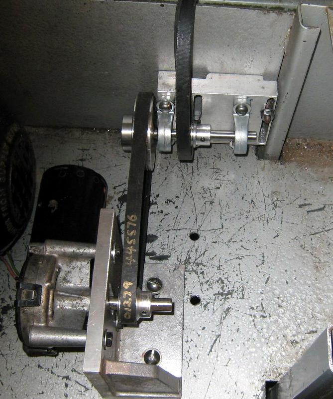 The windscreen wiper motor (bottom left) driving by speed-reducing pulleys to a small countershaft - all mounted on a shelf below the lathe. The right-hand belt (also by speed-reducing pulleys) drives upwards to the tailstock-end of the leadscrew.