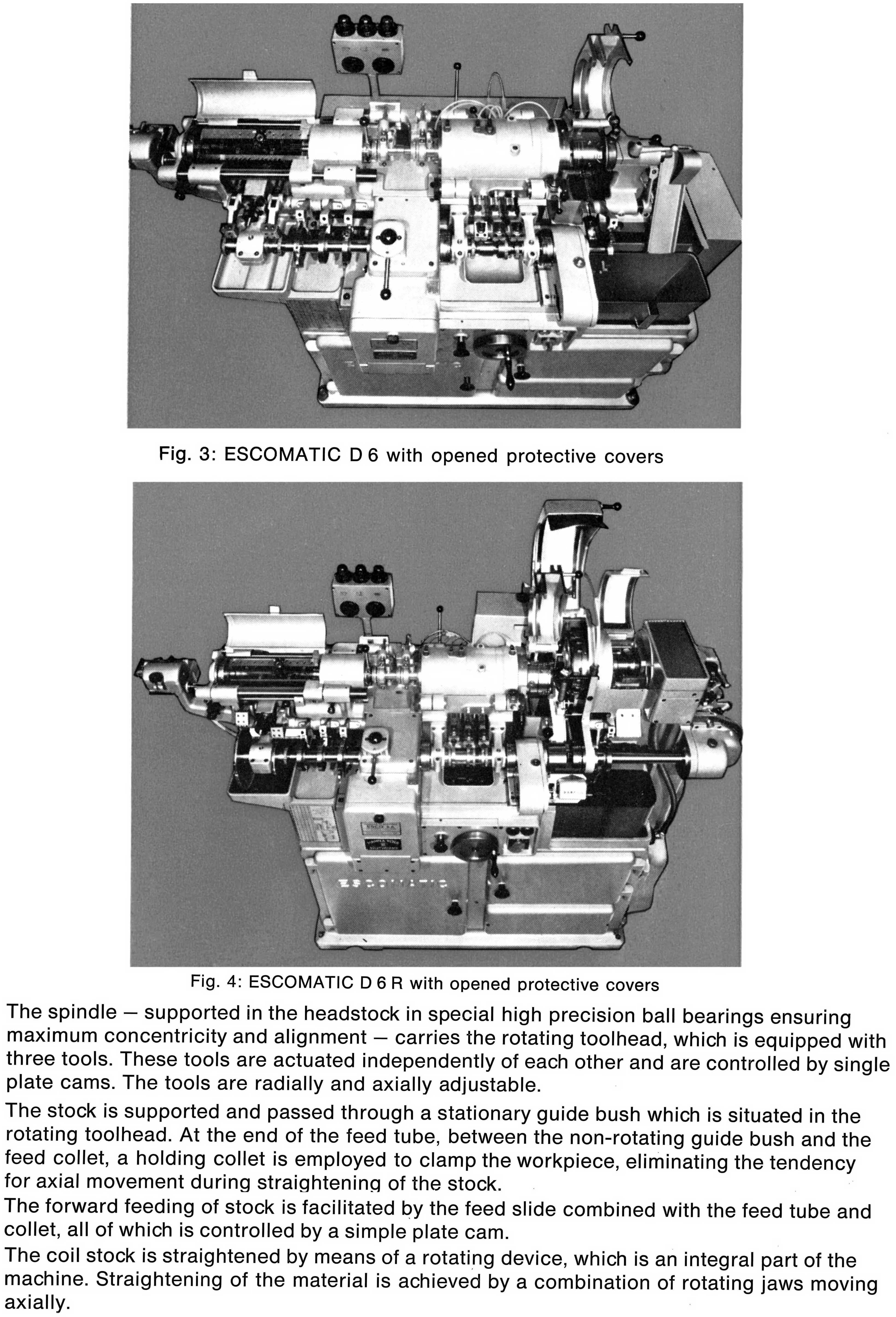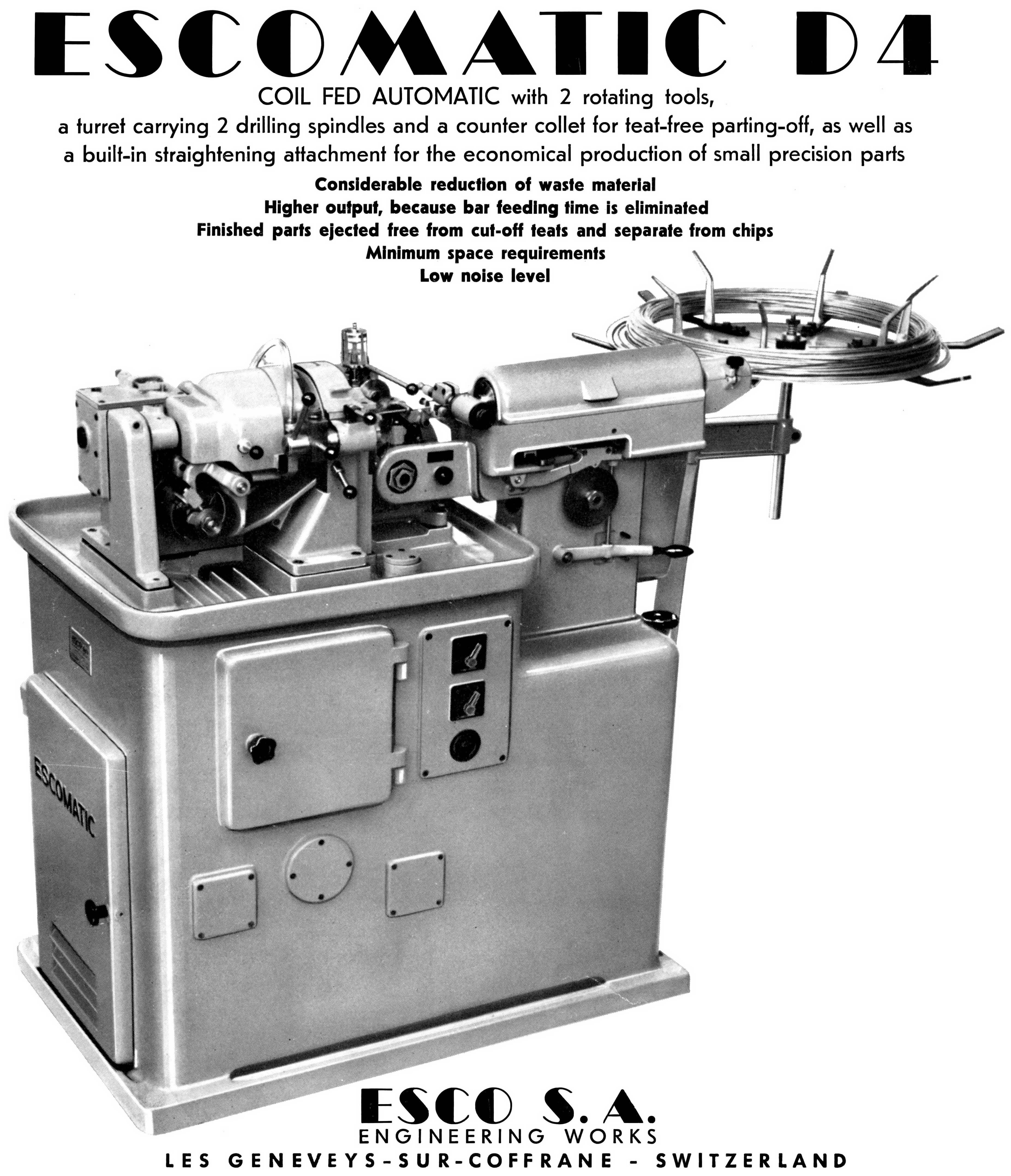 Still in production today in Switzerland by Ecso and equipped with the latest CNC control systems, Escomatic lathes were originally designed in the 1950s to offer high-speed production of parts for the watch-making industry. It quickly became apparent that they could also be employed for the automatic, high-speed production of many other tiny components and development of them continued to develop this facility. These ingeniously designed and beautifully-made lathes employ a unique concept - the cutting tools rotate around the material with the latter held stationary. In addition to turning, the lathes can be fitted with accessories that allow such operations as broaching, crimping, cross-drilling, milling, slotting, tapping, and threading. Depending upon the material (coil stock or bar) its diameter and the complexity of the part, items from 0.3mm to 8mm in diameter can be produced at rates from 3 to as many as 65 per minute - the latter being 96,000 in 24 hours and so offering unrivaled productivity at low cost..