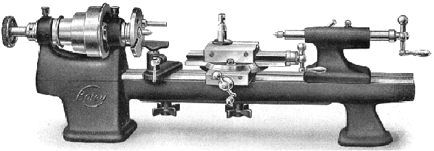 "Excel" was used as a brand by the B. Elliott Machinery Group - whose companies included Victoria, Cardiff, Progress, Invicta, Snow and others - to market a number of their lathes, specialised tool and jig millers, miniature jig-borers-cum-drillers, small jig borers, precision filing & sawing machines, tool & cutter and surface grinders & other machine tools from the 1930s until the 1960s. The name tended to indicated that the various products so labelled would be of better-than-average quality - and usually directed towards a specialised segment of the market - hence their Model L3N "bench precision lathe" of 4.5" centre height and 12.5" between centres was openly advertised as being of the "Boley & Leinen Type" and very closely followed that company's ideas for the design of a simple but very high-class bench lathe capable of the finest quality work. Manufactured in Great Britain by an unknown company within the Elliott group, it was, at one time, surprisingly common on the second-hand market, a situation that probably indicated the government taking quantities of them during and possibly after World War 2. So, not a machine intended, when new, for amateur use - though once on the used market the very high quality was very appealing and many were pressed into service by clockmakers and model engineers. The writer was lucky enough to have several examples pass through his hands during the 1970s and can personally vouch for their longevity and high quality. However, Elliott was not the only company in the field for, at the same time (during WW2 when supplies from the Swiss Company Schaublin and, of course, German machines by G.Boley, Leinen, Lorch and Wolf Jahn were not available) precision bench lathes were also being manufactured by, amongst others: Benson, BWC, Cromwell, CVA, Holbrook and Woodhouse and Mitchell (though only one example of the latter has so far been found). 323/8-inch long, the bed of the Excel L3N and its mounting feet were cast as one with stiffening ribs adding to the rigidity of what was already a very heavy casting. The bed ways consisted of a front V and a rear flat, both ground-finished and carrying, as standard, just a hand T-rest that was supplied with both wide and narrows rests; available as an option (at what would have been a considerable cost), was a very well constructed compound slide. This unit, with its all-ground-finish on both working and cosmetic parts, was normally supplied with screw-feed on both cross and top slide but examples have been found of the L3N with all-lever feed slides and both a lever-operated cross slide with a screw-feed top slide and a screw-feed cross slide with a lever-action top. It is not known if the much greater variety of slides produced for the Leinen and Boley & Leinen versions were available for the Excel, but the fact that components were interchangeable between the makes would have helped the more impecunious enthusiast looking on the second-hand market for parts. The standard toolpost was the usual triangular clamp but, as a rather thoughtful touch, fitted with a rotating strip that prevented the end of the levelling screw from marking the surface of the top slide. An American-style toolholder was also available but, instead of being fitted with a separate dished "wobble" washer (that allowed the curved "tool support" to rock the tool point up and down), formed the dish direct into the metal of the top slide. Bed fittings were secured by long bolts though-bolts terminating in large hand-nuts with rather uncomfortable-to-grip flat wings; however, if the lathe failed on this small but easily corrected point, the 2-inch diameter compound slide-rest micrometer dials made up for it: of the zeroing type, and with especially clear engraving and easy-to-grip knurled edge rings, they were copies of those used on Leinen and Boley & Leinen lathes of the late 1930s and, it must be said, a complete departure from earlier tiny units (first used during the 1800s) with their distinctive "narrow twin-ring" knurled grips. As a further refinement the longitudinal fit of the dials on their feed screws (and hence any backlash), could be precisely adjusted by the manipulation of two miniature C rings. Both feeds screws were 10-t.p.i. and made from nickel-chrome steel, ran though adjustable phosphor-bronze nuts and were completely enclosed beneath the slides and so protected from swarf and dirt. The long-travel top slide top slide could be swivelled 45° each side of zero and carried a single triangular toolpost supported by a spring and with a knurled levelling screw. Continued below: