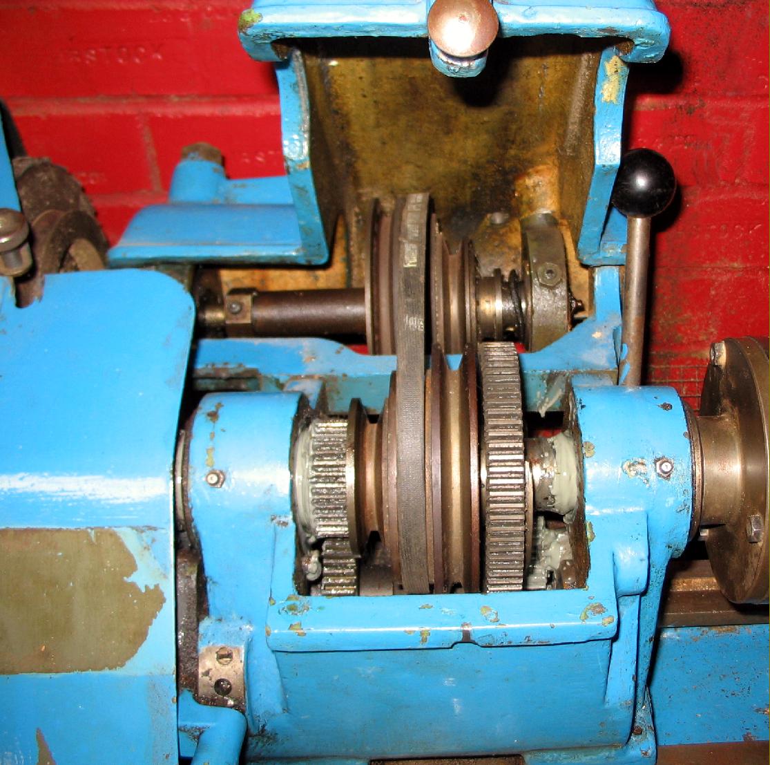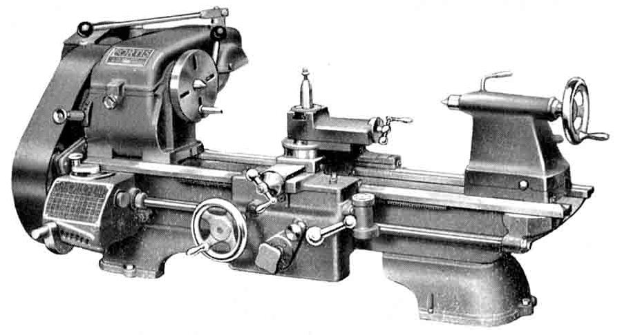 Continued: All versions of the Fortis were equipped with a screwcutting gearbox and power cross feed with the "Precision" types listed as: Model E for use on the customer's own bench with the motor positioned behind the headstock (£215); the Model E/B fitted to what the distributors called their "base" twin-pedestal stand with the motor contained within the left-hand leg -yet at £259 this was more expensive than the Model E/C mounted on a proper sheet-steel cabinet (again with the motor inside) at £235. An improved specification came with the Model M, a lathe that had the facility to generate 72 metric pitches as well as the normal 48 English ; this version was listed as the M for bench mounting (£245), the M/B on a twin-pedestal stand (£289) and M/C on the sheet metal cabinet (£265). The "Standard" lathes had the suffix S, with the Model S being the basic unit for bench mounting (£178) or, if fitted to the full cabinet stand, as the S/C (£198). With both English and metric screwcutting the bench lathe was the S/M (£210) and the stand-mounted unit the SM/C (£229) There was no option to have the cheaper "Standard" lathe mounted on the more expensive twin-pedestal stand. Although, by the late 1940s, the American-market Clausing 100 had changed considerably in detail from the version first made in the middle of the decade, the Fortis appears to have followed an almost independent development path (or resulted from building a modified copy). However, some features of the early 100 models were retained, including the "split-clamp" type tailstock and the operation lever for the combined spindle clutch and brake mounted on the right-hand side of the headstock. Other differences discovered on the Fortis include: the bed feet, like those on a Raglan lathe, were secured by two bolts at the headstock and, to allow the bed to take up an unstressed position, just one at the tailstock end that was intended to be "nipped down" only enough to stop the machine moving on its bench; the bed had one ground 'V' way at the front that consisted of two sections with a joint in the middle - as a consequence the tailstock ran on the two inner flat ways, a unique departure from usual Clausing practice; the handles for the cross slide and top-slide screws were special items, with (for the era) very large and much-improved 2-inch diameter micrometer dials; the Apron was a 'Fortis special' and, though externally resembling the Clausing "simplified-pattern", was actually a fully-automatic type taking the longitudinal drive from a worm-screw system. The apron it most closely resembled was that used on the Clausing Mark II 100 Series but, unlike those, was of lighter, single-wall construction with lubrication provided (via an oil can) through a fitting on the front - from where it flowed to a small cast-in cup at the rear that allowed a supply to trickle down to the worm-gear mechanism. In addition the Fortis apron (like the early 100 and 200 "simplified" and early 200 series "fully-automatic" types) differed from all later designs (as fitted to the 100, 200, 4800, 5000 and 6000 models) in being secured to the saddle by two bolts instead of four. This was the reason for the characteristic 'stepped-out" front of both Fortis and early 200-Series automatic aprons - a design that involved the use of a correspondingly narrow saddle. The changewheels guard was also different to the American-market lathes, being a rather crude-looking pressing instead of a cast cover. For more details of the Clausing 100/Fortis lathe go to the Clausing section of the Archive. Fortis and Broadway pictures continued here
